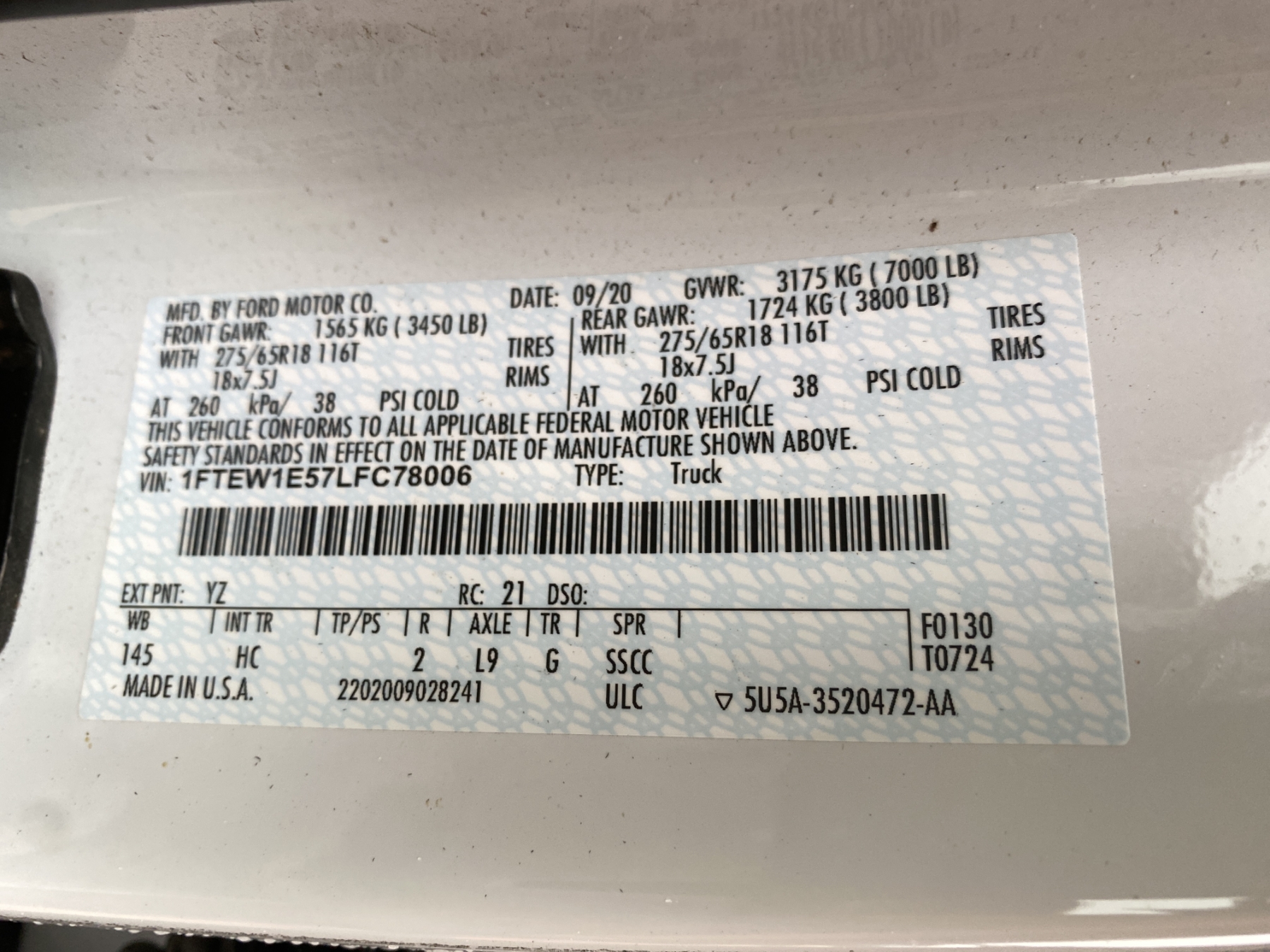 Vehicle ID Number: 1FTEW1E57LFC78006