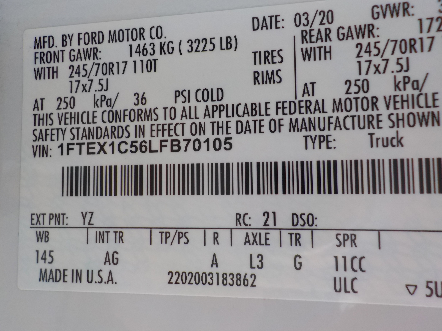 Vehicle ID Number: 1FTEX1C56LFB70105