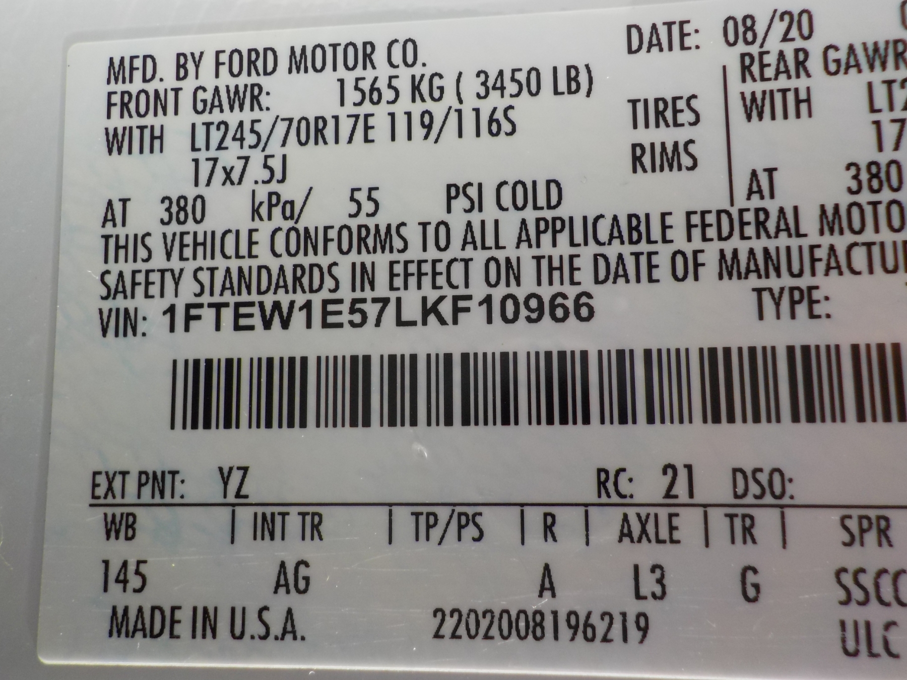 Vehicle ID Number: 1FTEW1E57LKF10966
