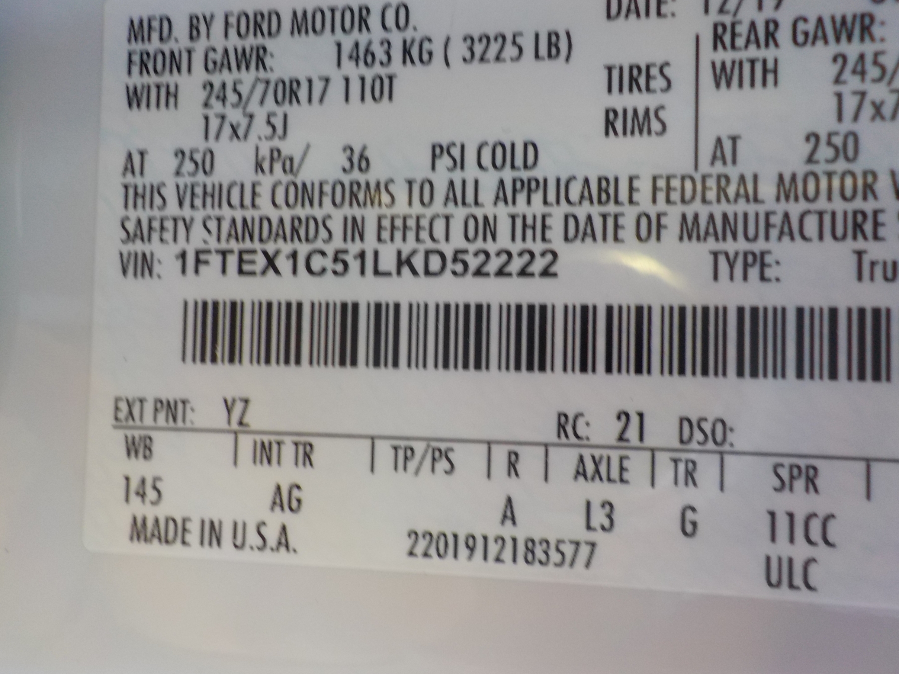 Vehicle ID Number: 1FTEX1C51LKD52222