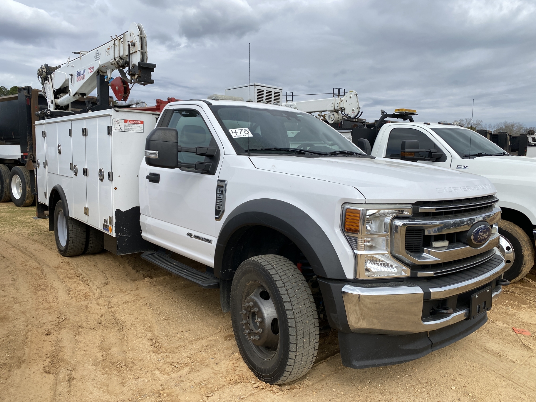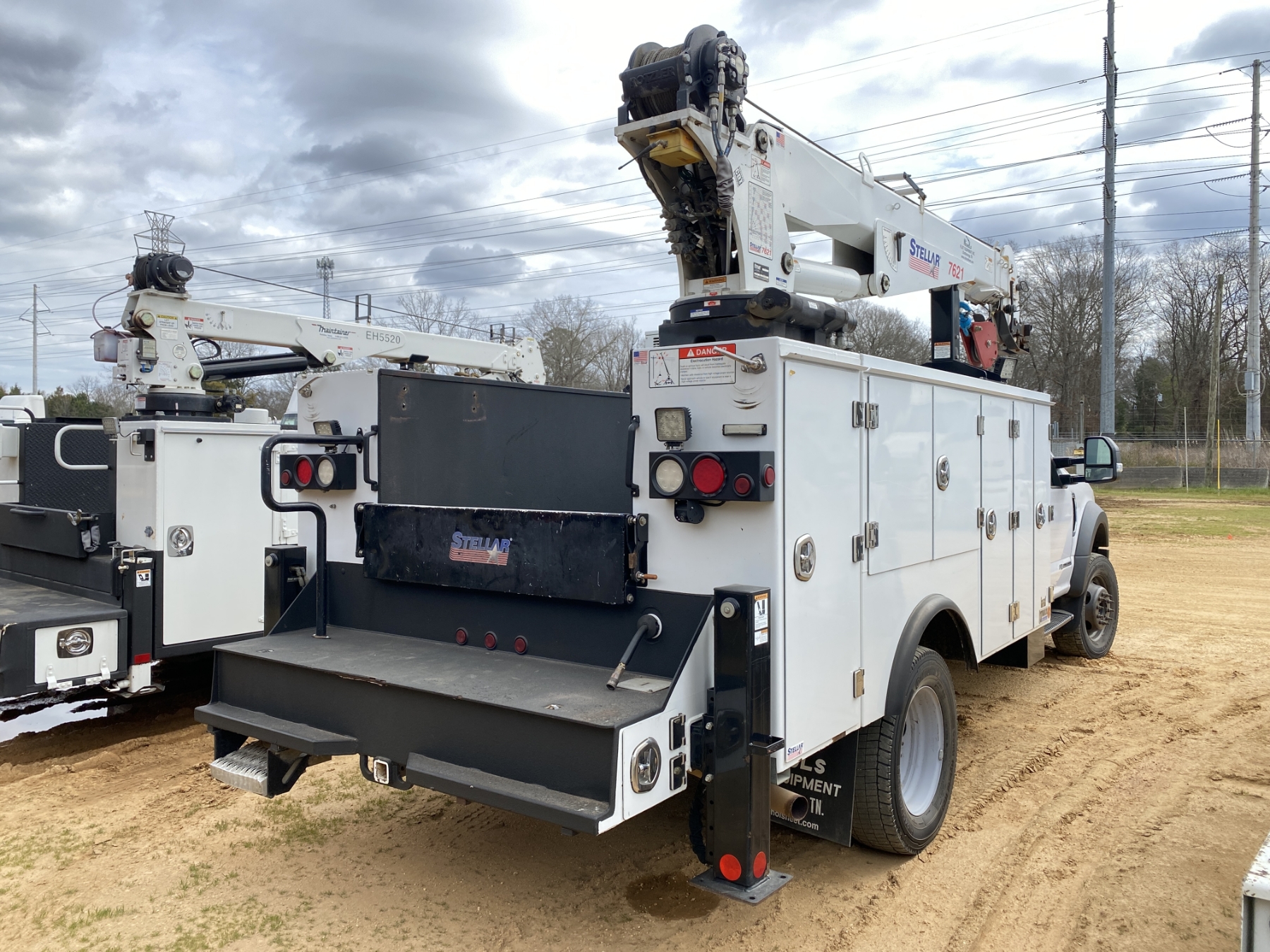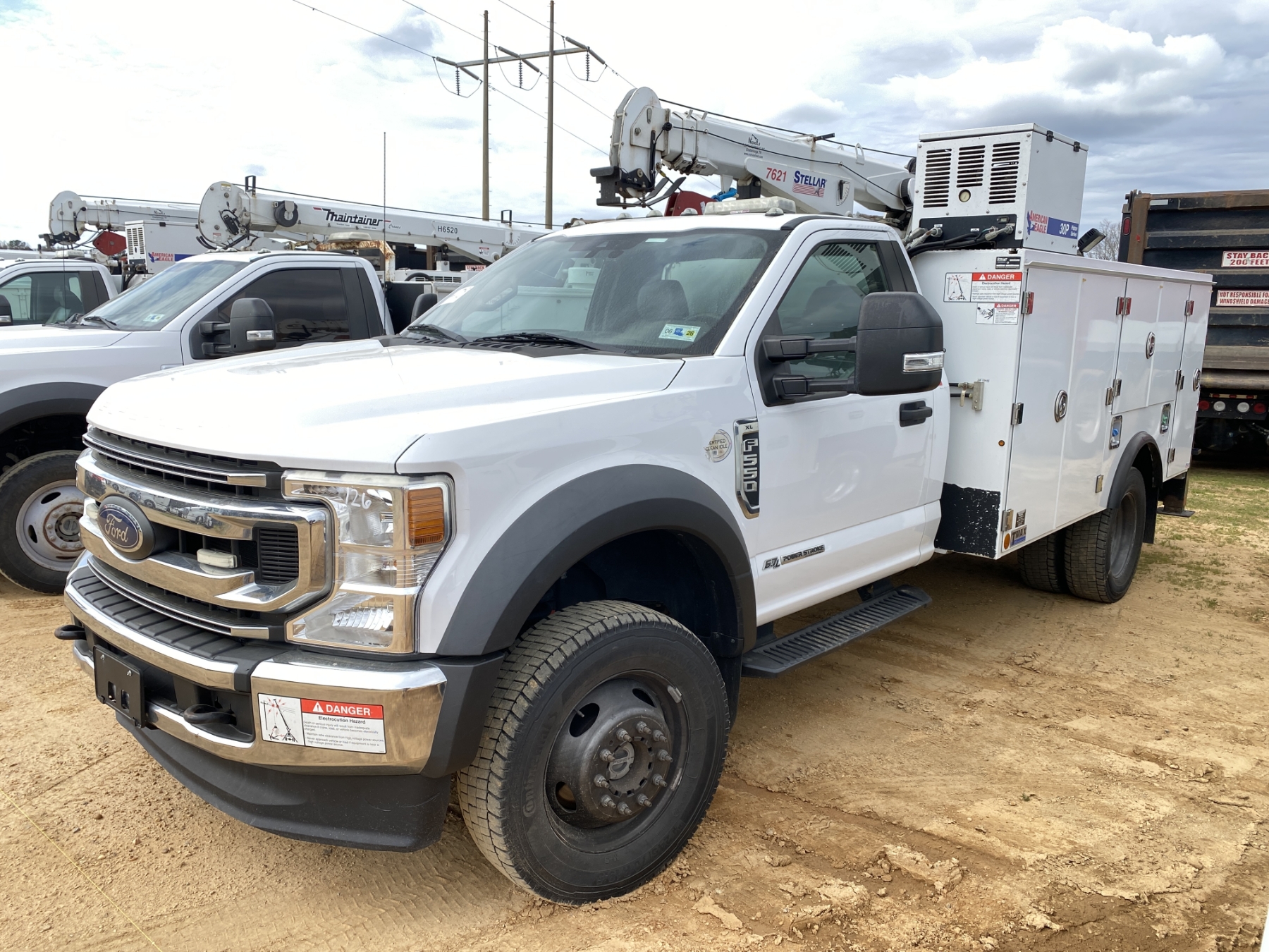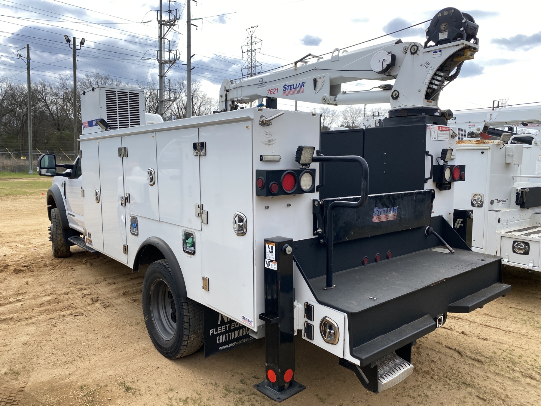 4x4, Power Stroke diesel, A/T, Stellar TMax1-11 service body, Stellar 7621 crane, 7,500 lb. capacity, 21' reach, American Eagle 30P hyd air compressor, 20 gallon hyd tank, workbench bumper w/ vice mount