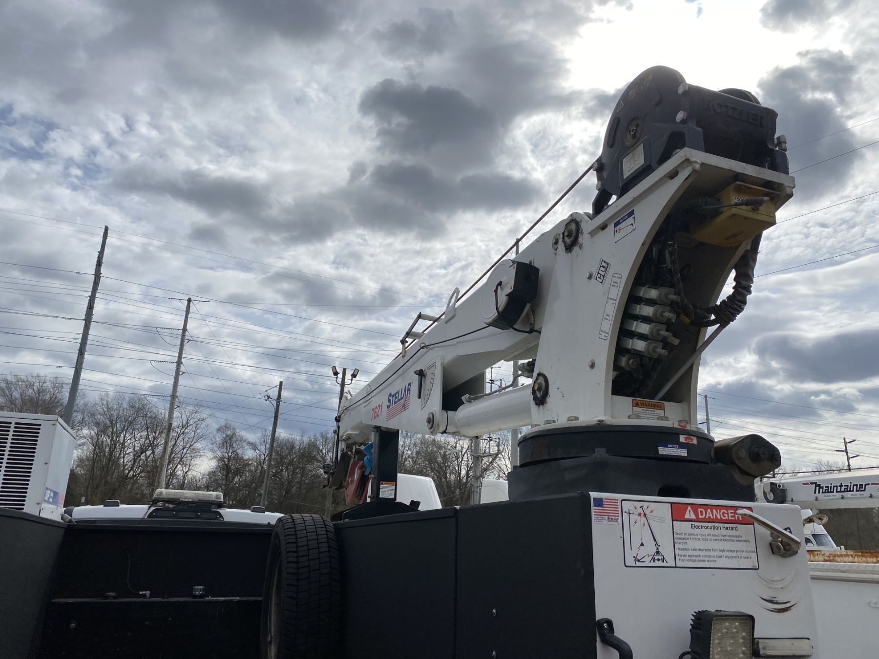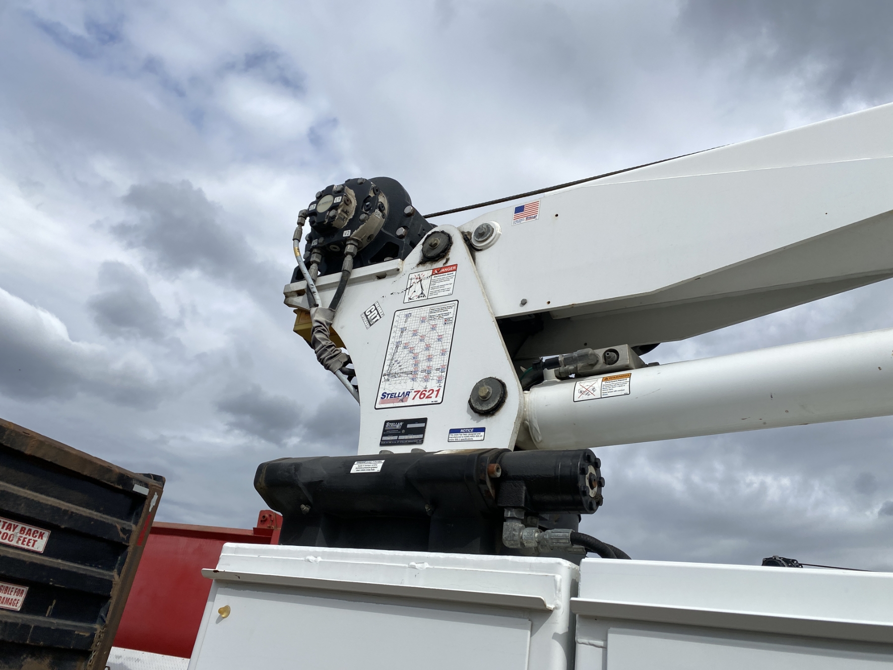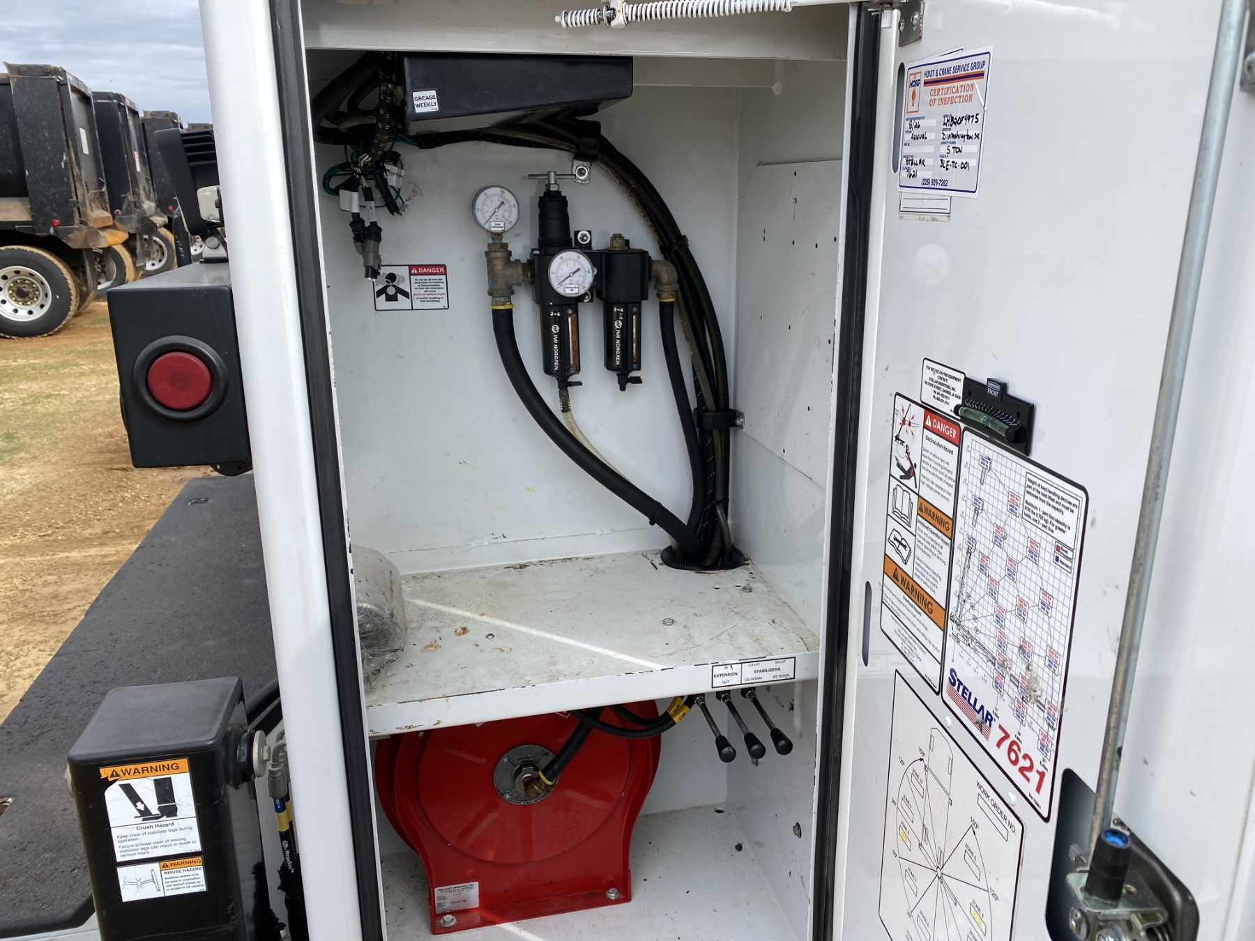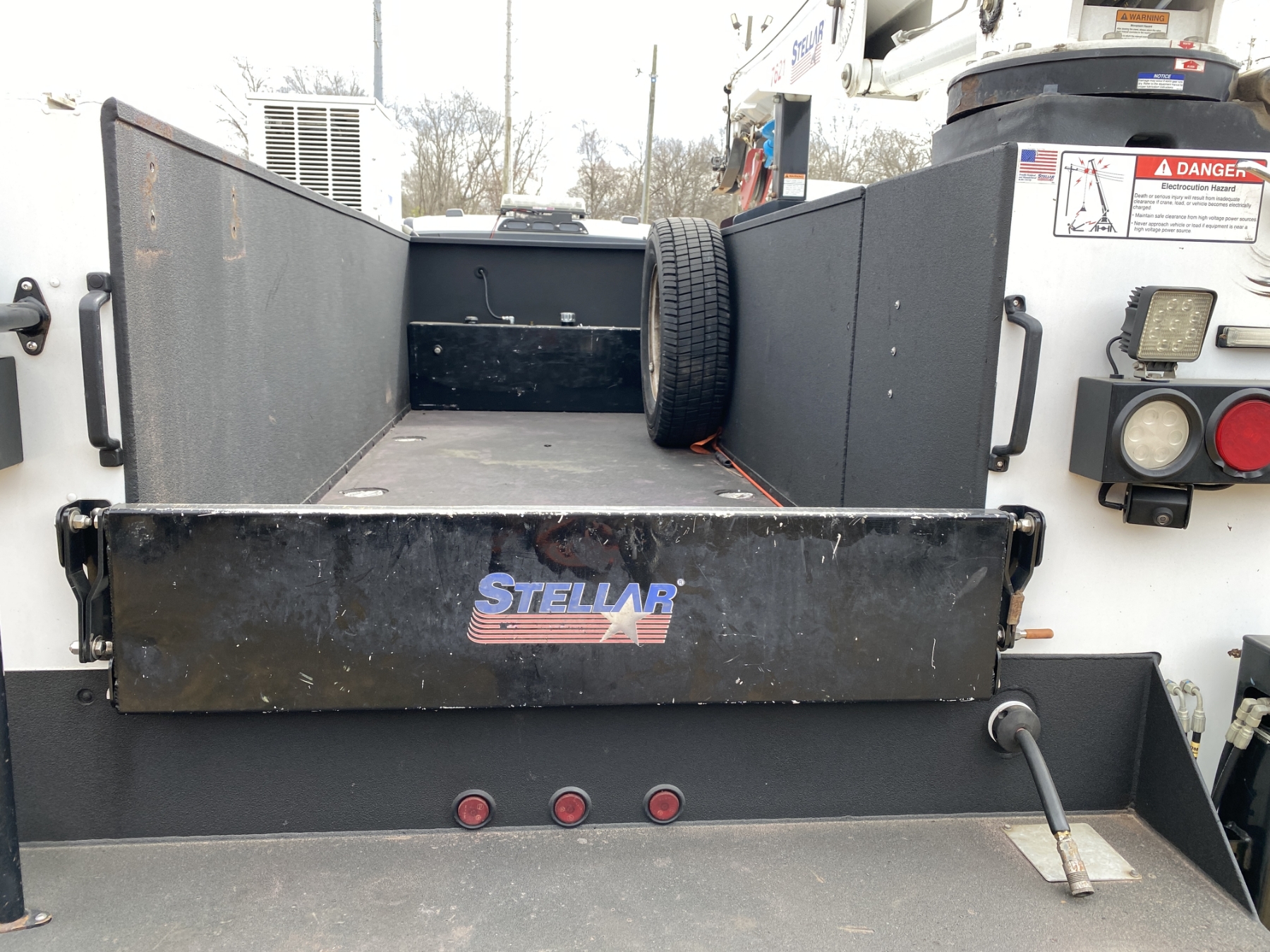 4x4, Power Stroke diesel, A/T, Stellar TMax1-11 service body, Stellar 7621 crane, 7,500 lb. capacity, 21' reach, American Eagle 30P hyd air compressor, 20 gallon hyd tank, workbench bumper w/ vice mount