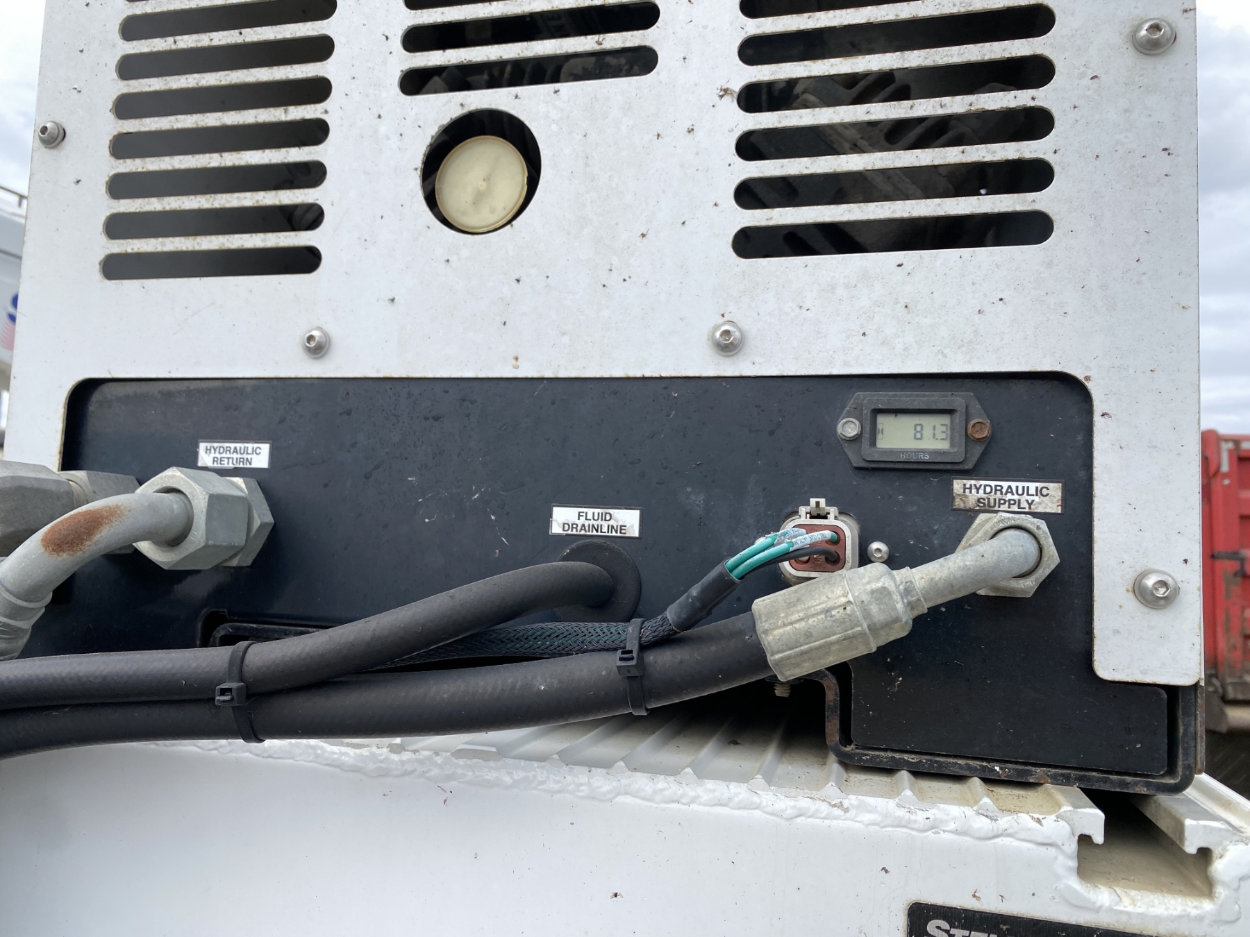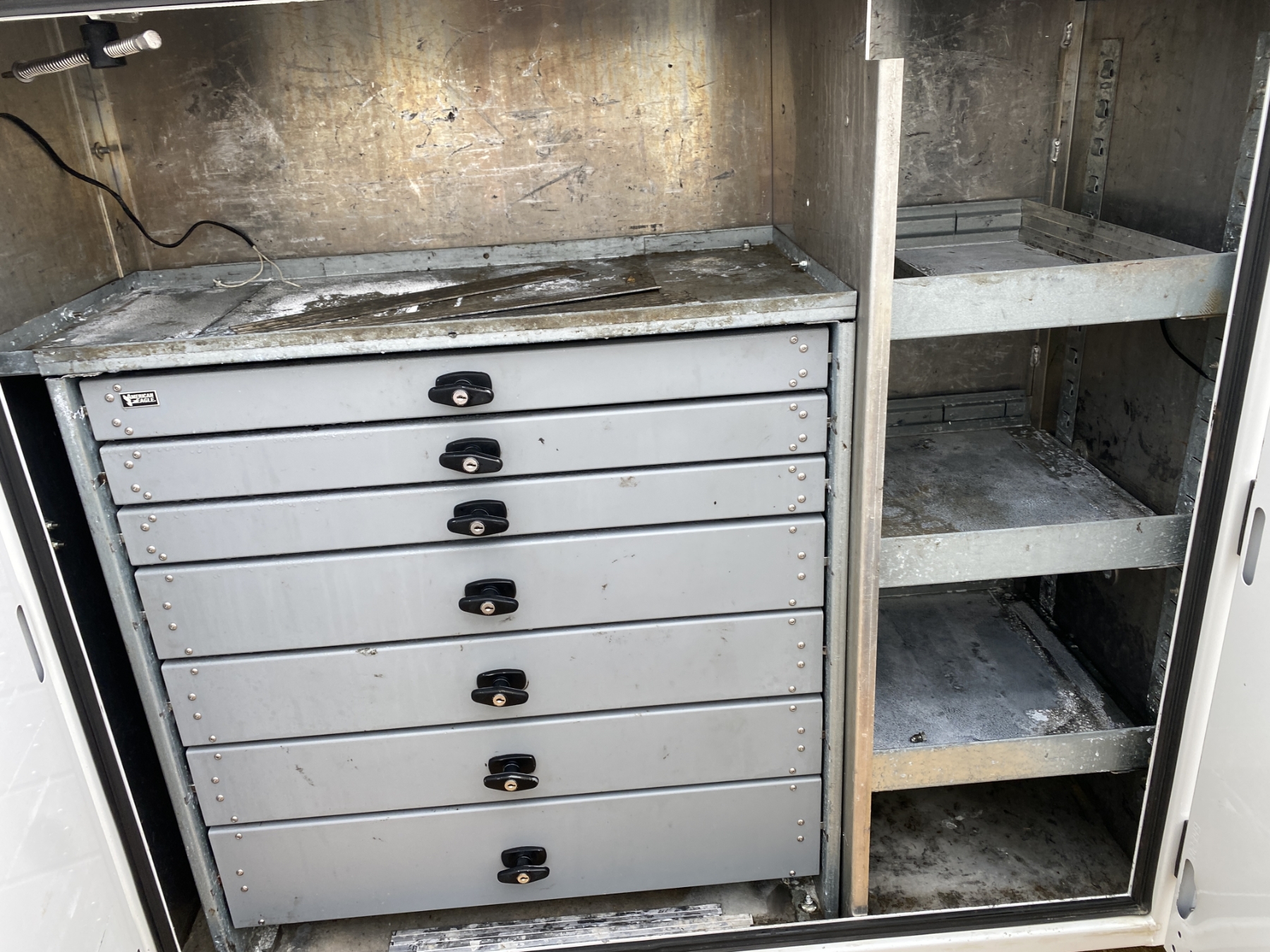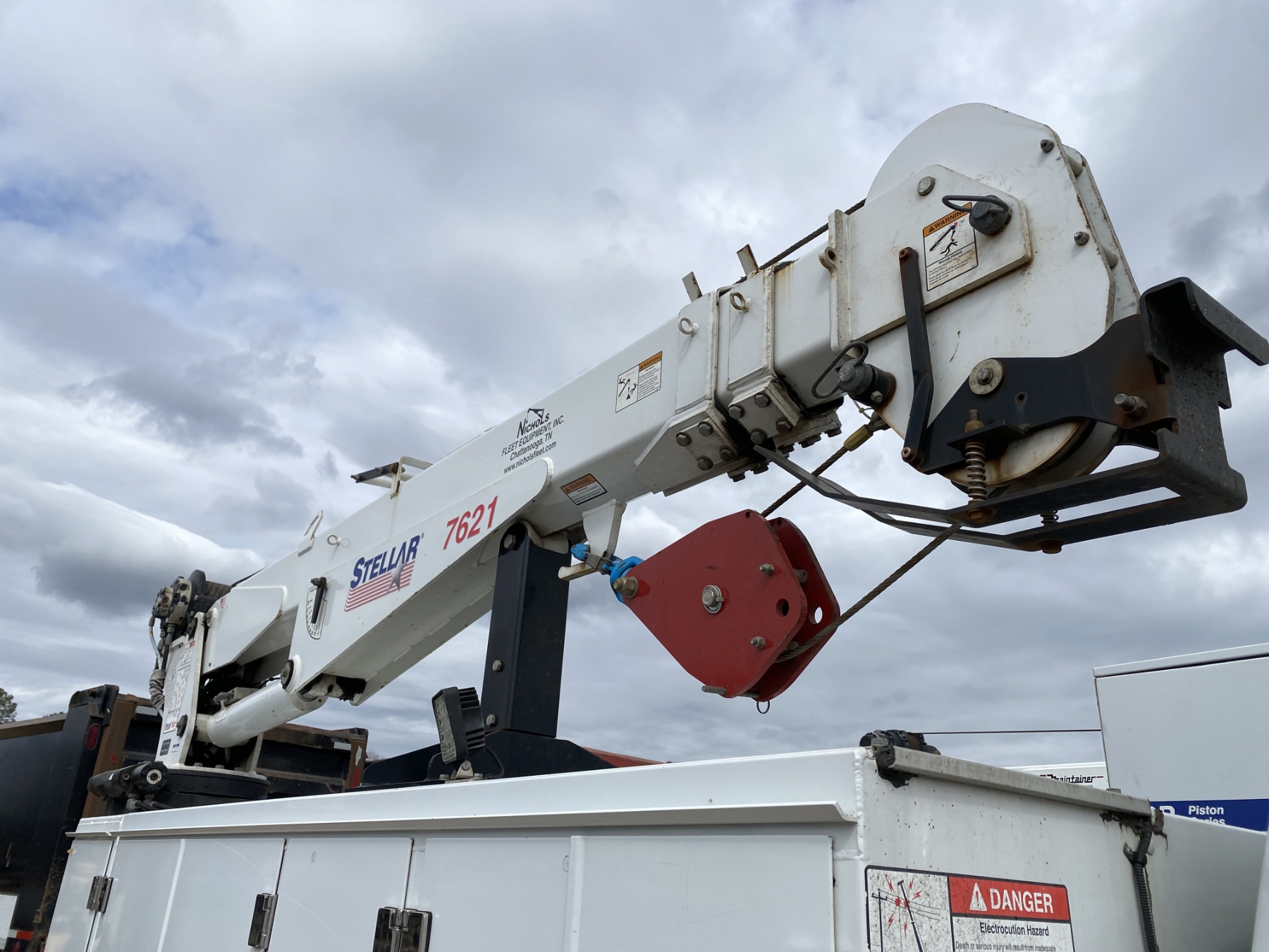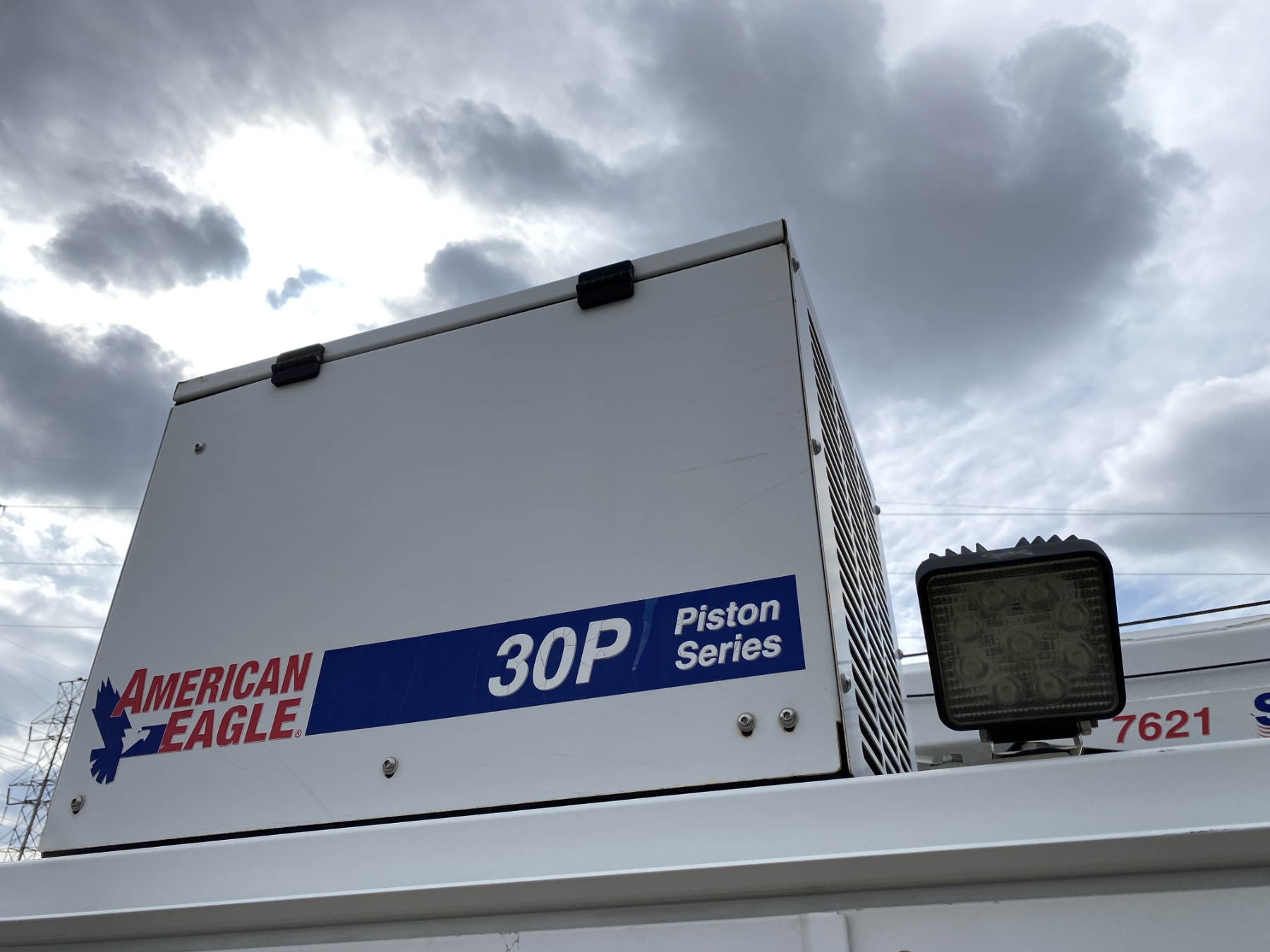 4x4, Power Stroke diesel, A/T, Stellar TMax1-11 service body, Stellar 7621 crane, 7,500 lb. capacity, 21' reach, American Eagle 30P hyd air compressor, 20 gallon hyd tank, workbench bumper w/ vice mount