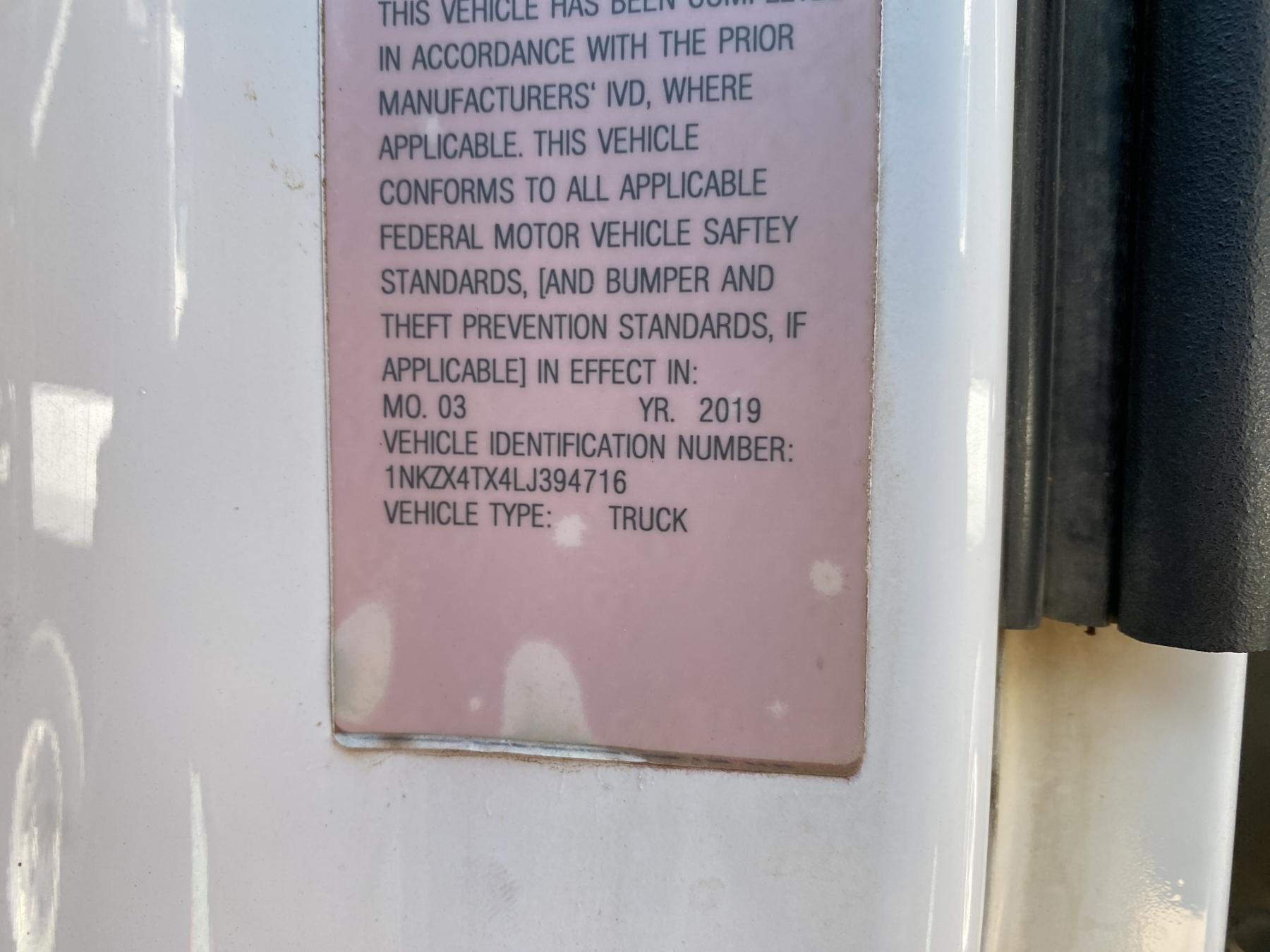 Vehicle ID Number: 1NKZX4TX4LJ394716