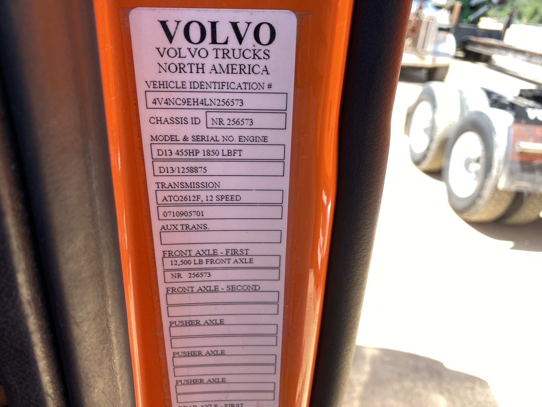 T/A, 455 HP Volvo D13 engine, A/T, 40K rears, air ride, 12,350 lb. front, 235" W/B, Mid Roof, 11R22.5 tires