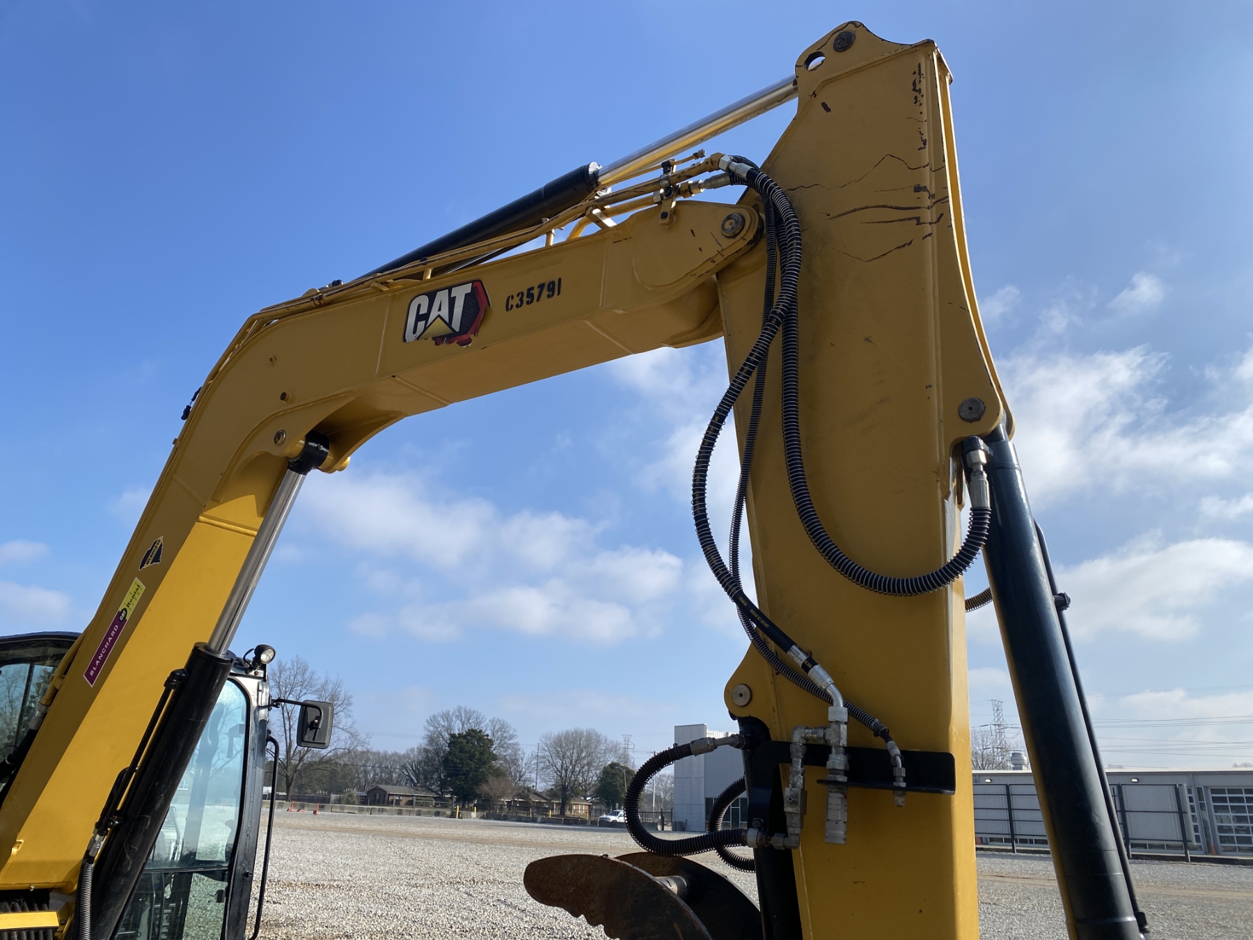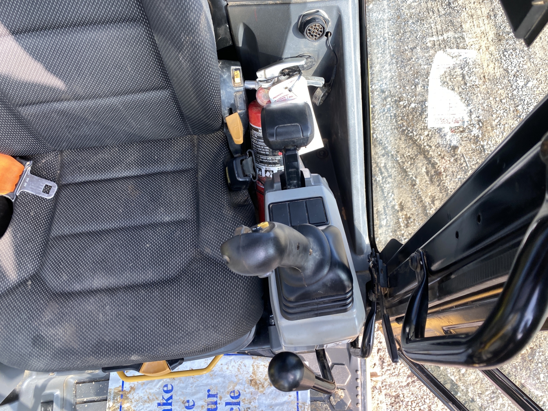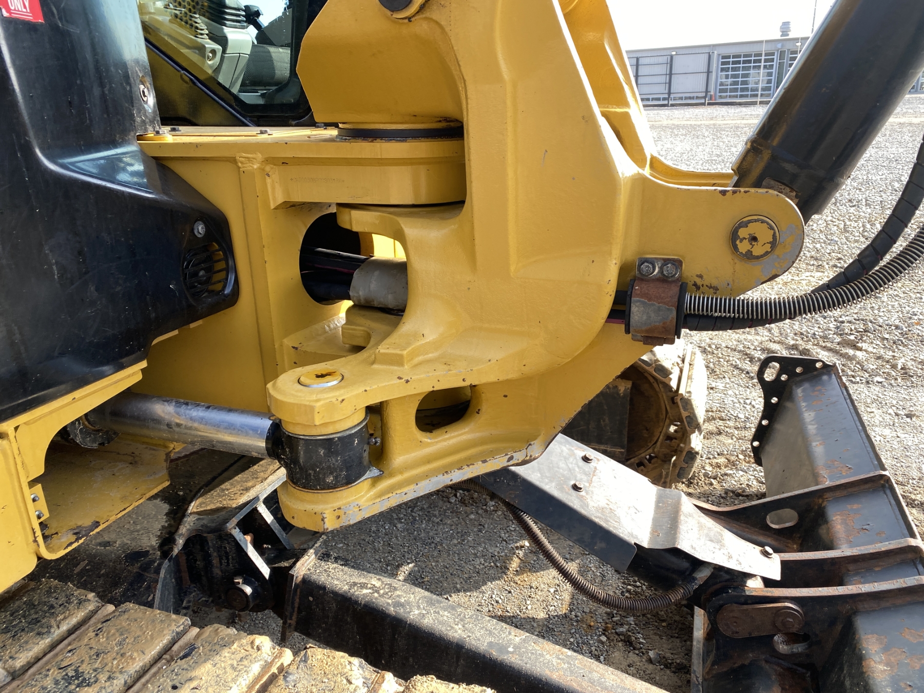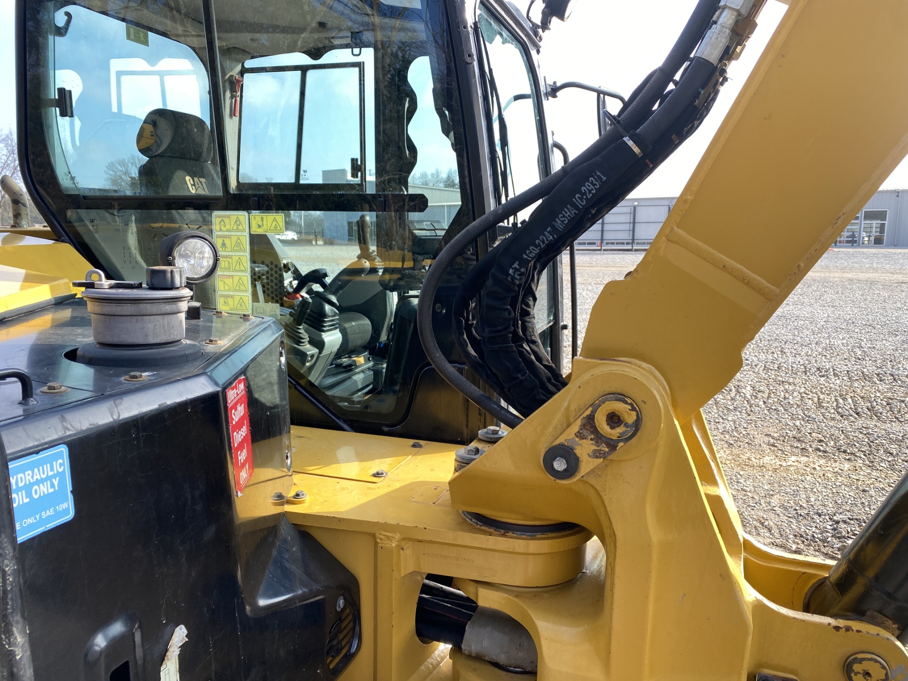 7' 9" stick, 36" bucket, hyd thumb, aux hyd, blade, rubber pad inserts, cab, A/C