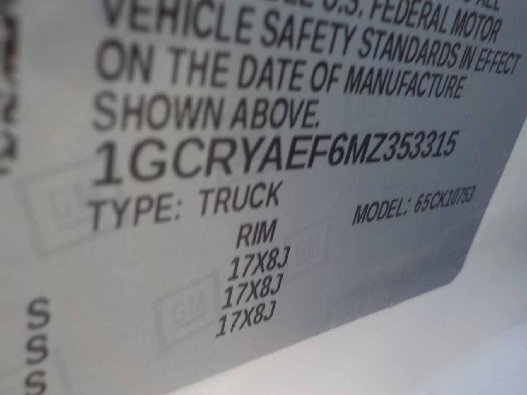 Vehicle ID Number: 1GCRYAEF6MZ353315