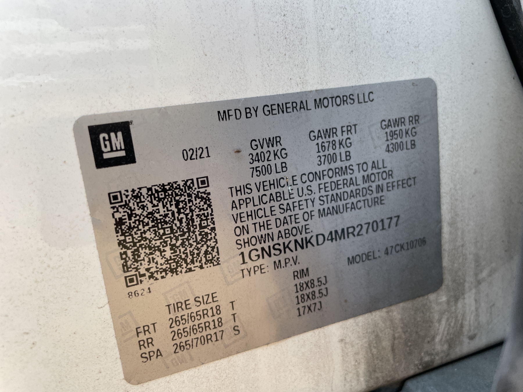 Vehicle ID Number: 1GNSKNKD4MR270177