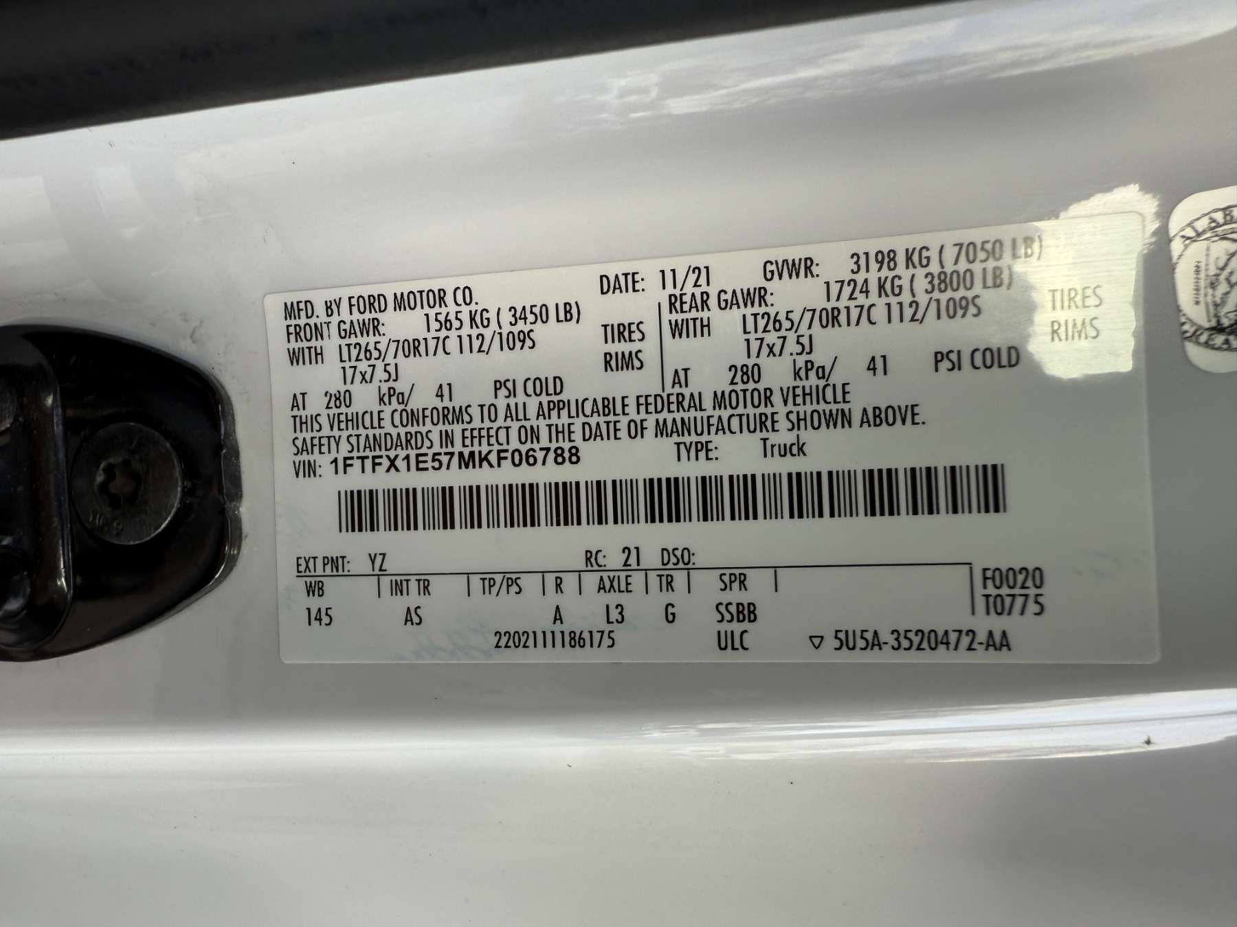 Vehicle ID Number: 1FTFX1E57MKF06788