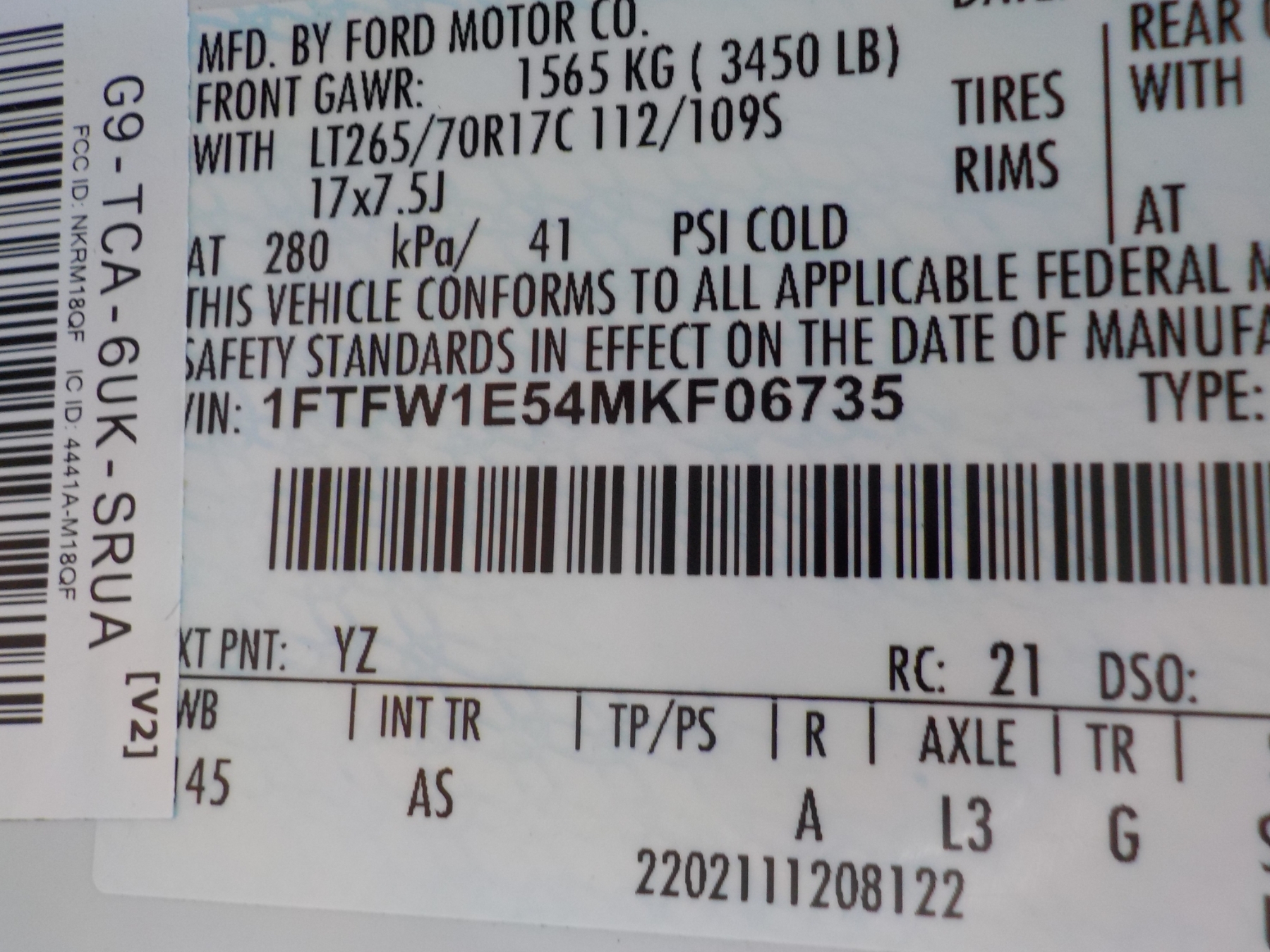 Vehicle ID Number: 1FTFW1E54MKF06735