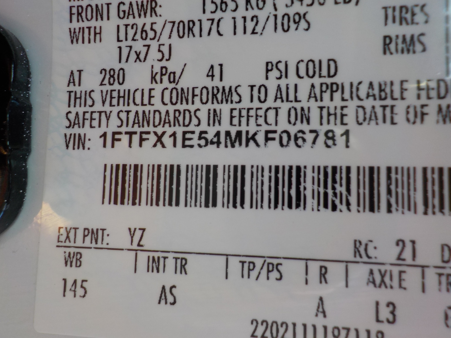 Vehicle ID Number: 1FTFX1E54MKF06781