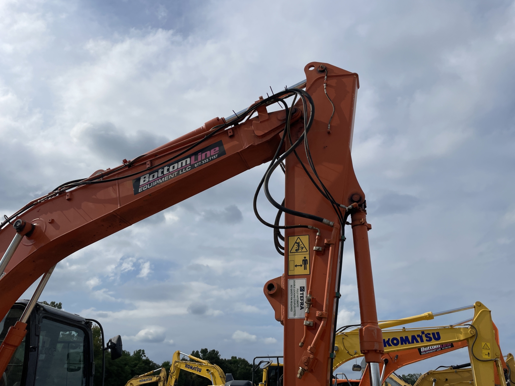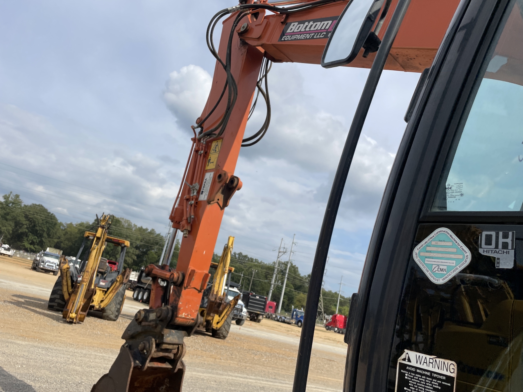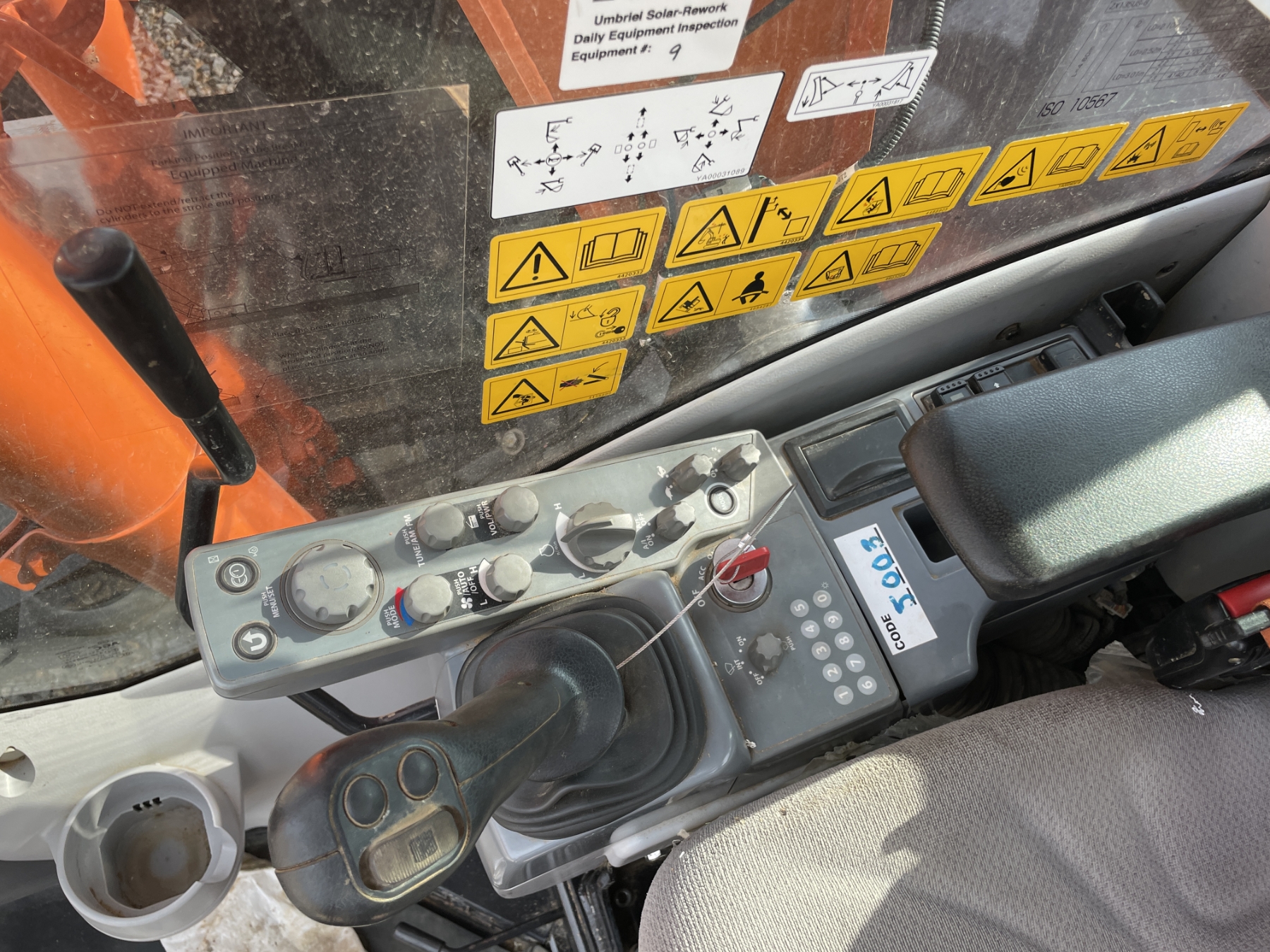 9' 9" stick, 24" bucket, coupler, aux hyd, blade, cab, A/C