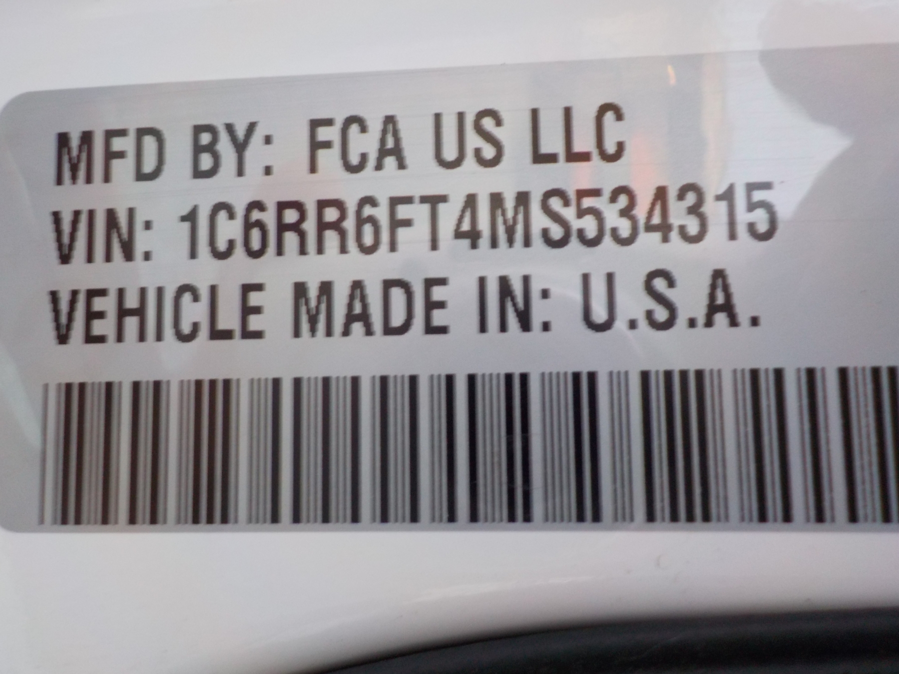 Vehicle ID Number: 1C6RR6FT4MS534315