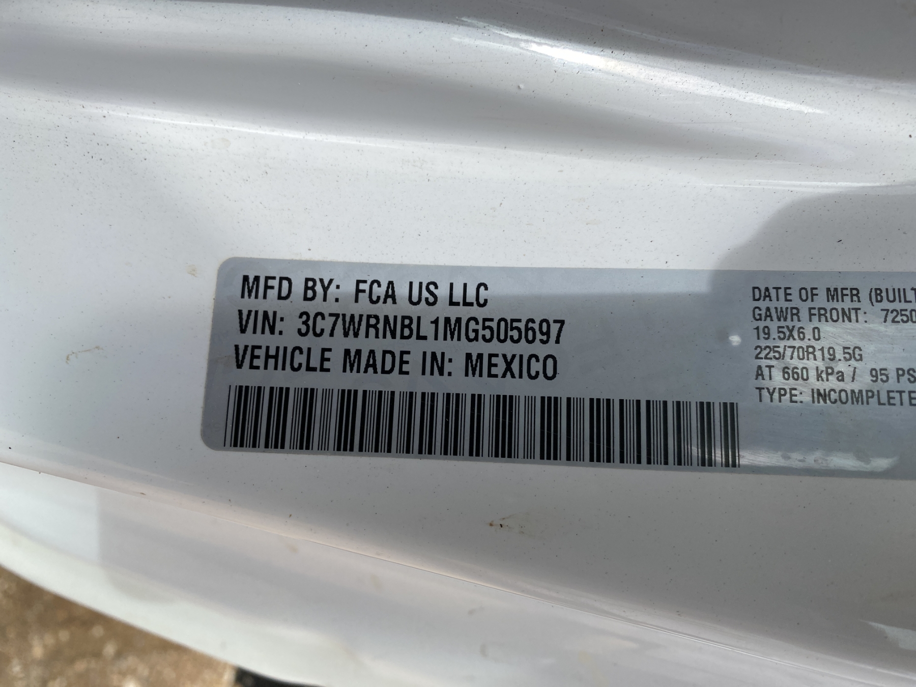 Vehicle ID Number: 3C7WRNBL1MG505697