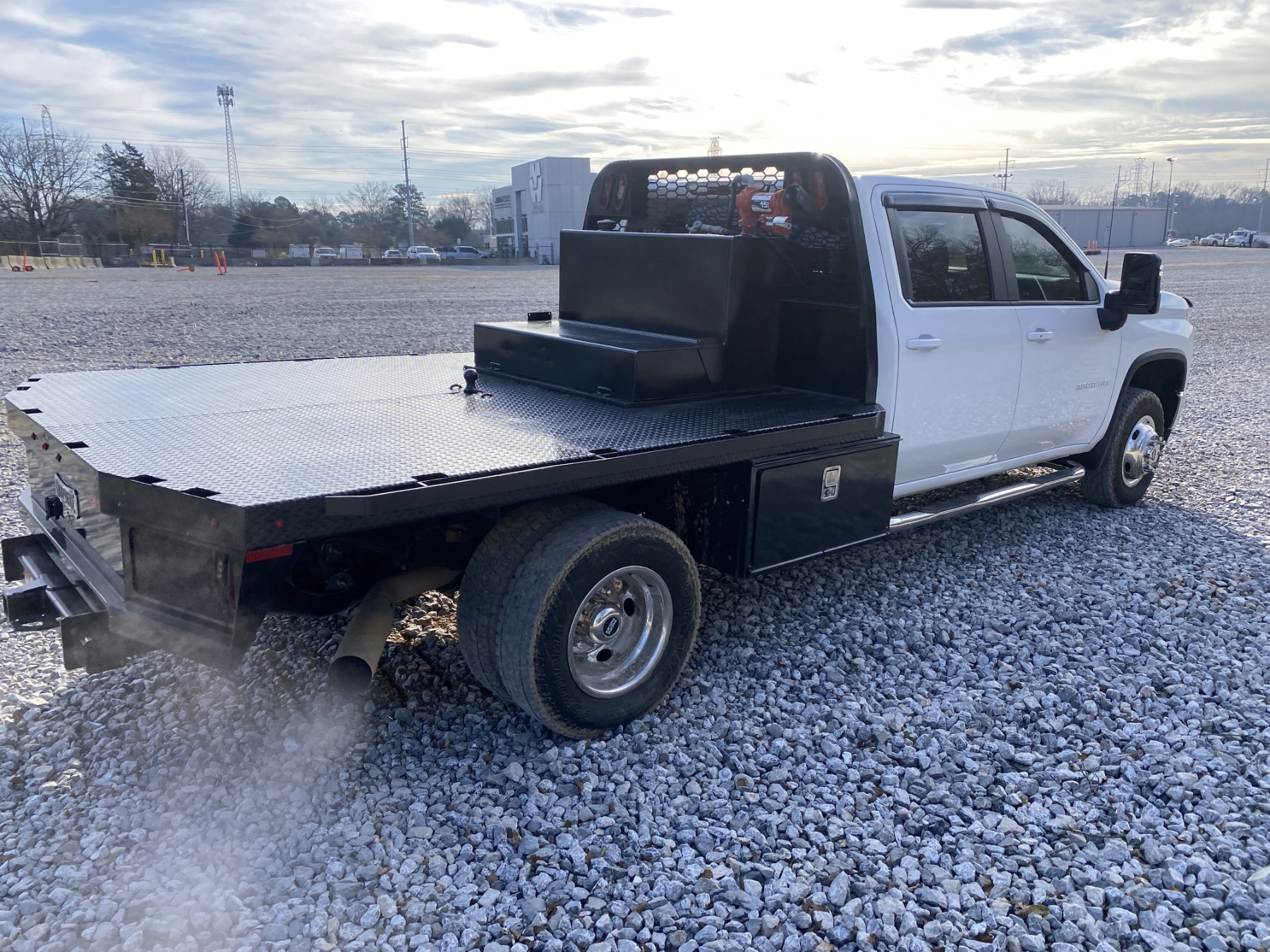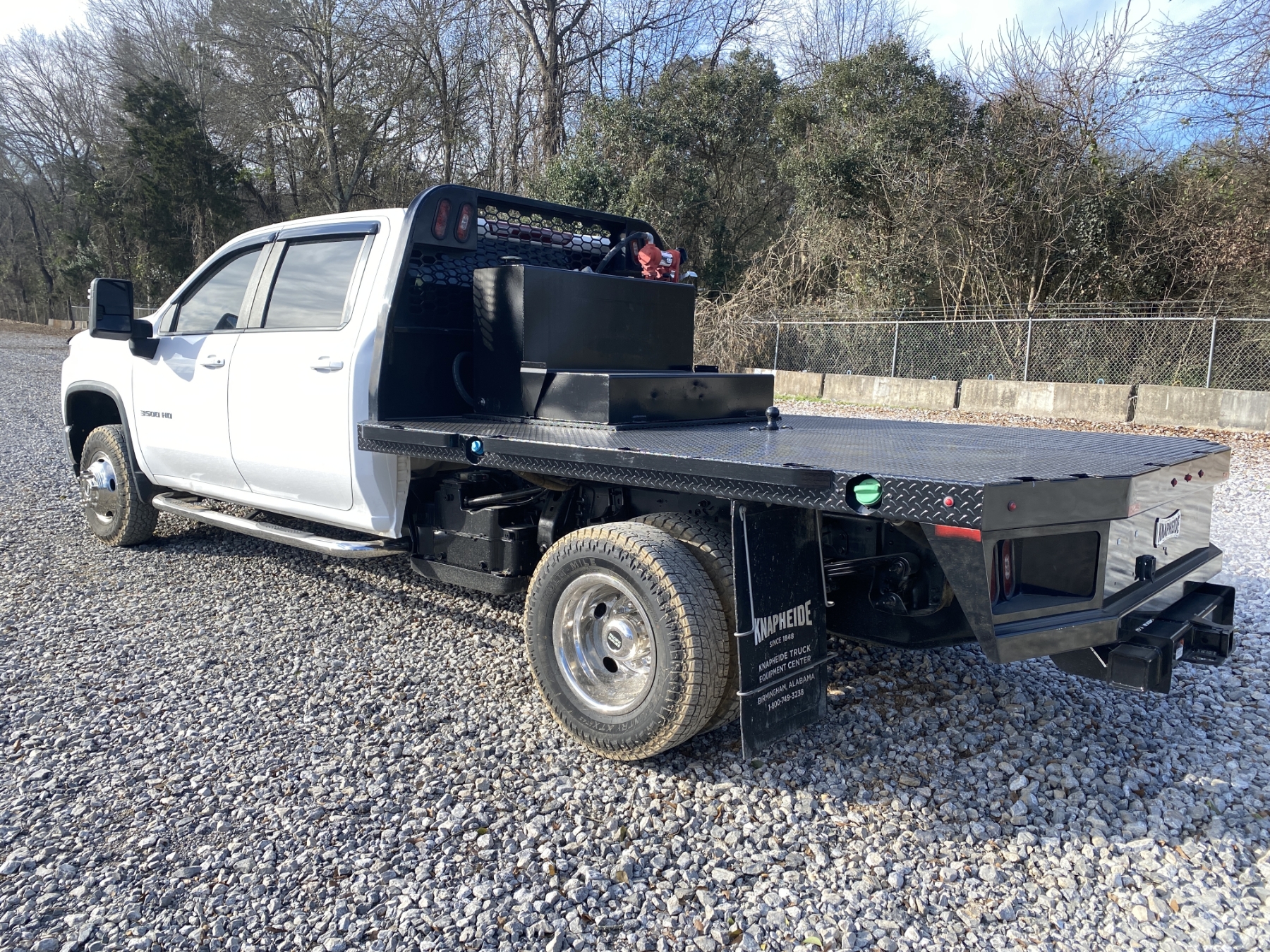 dually, 4x4, crew cab, Duramax diesel, A/T, 9' Knapheide flatbed, fuel tank