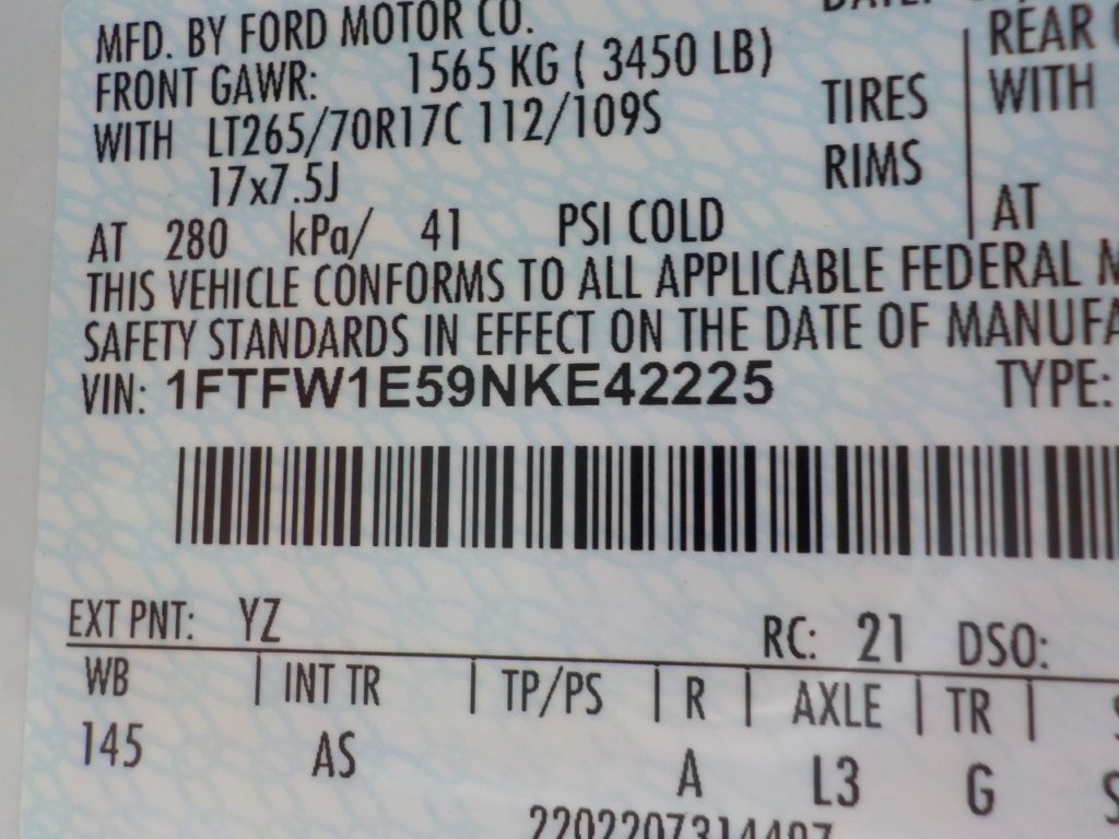 Vehicle ID Number: 1FTFW1E59NKE42225