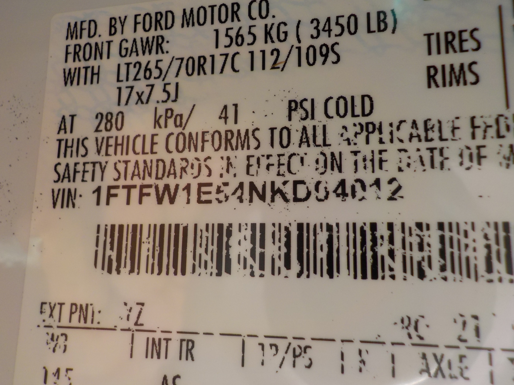 Vehicle ID Number: 1FTFW1E54NKD04012