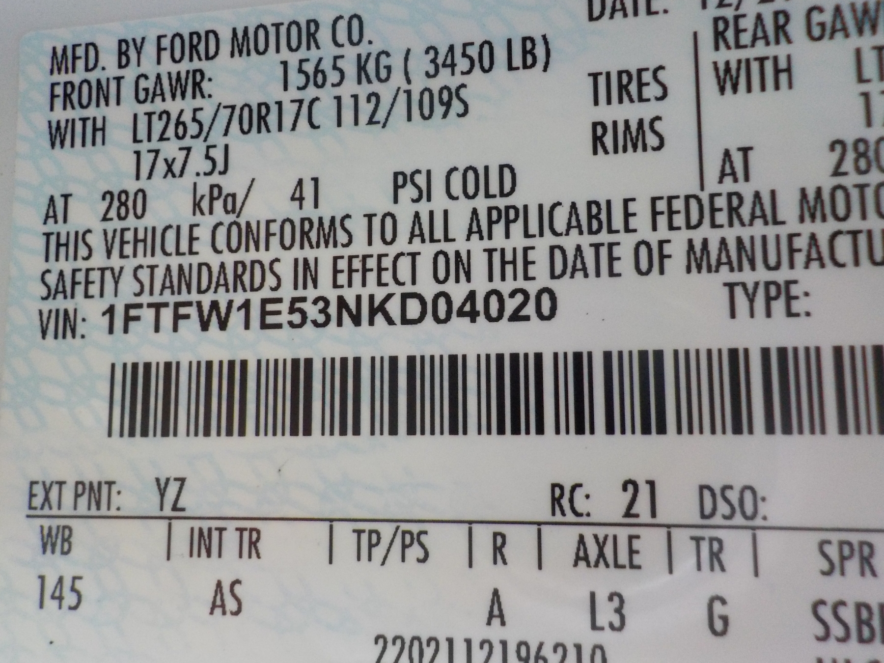 Vehicle ID Number: 1FTFW1E53NKD04020