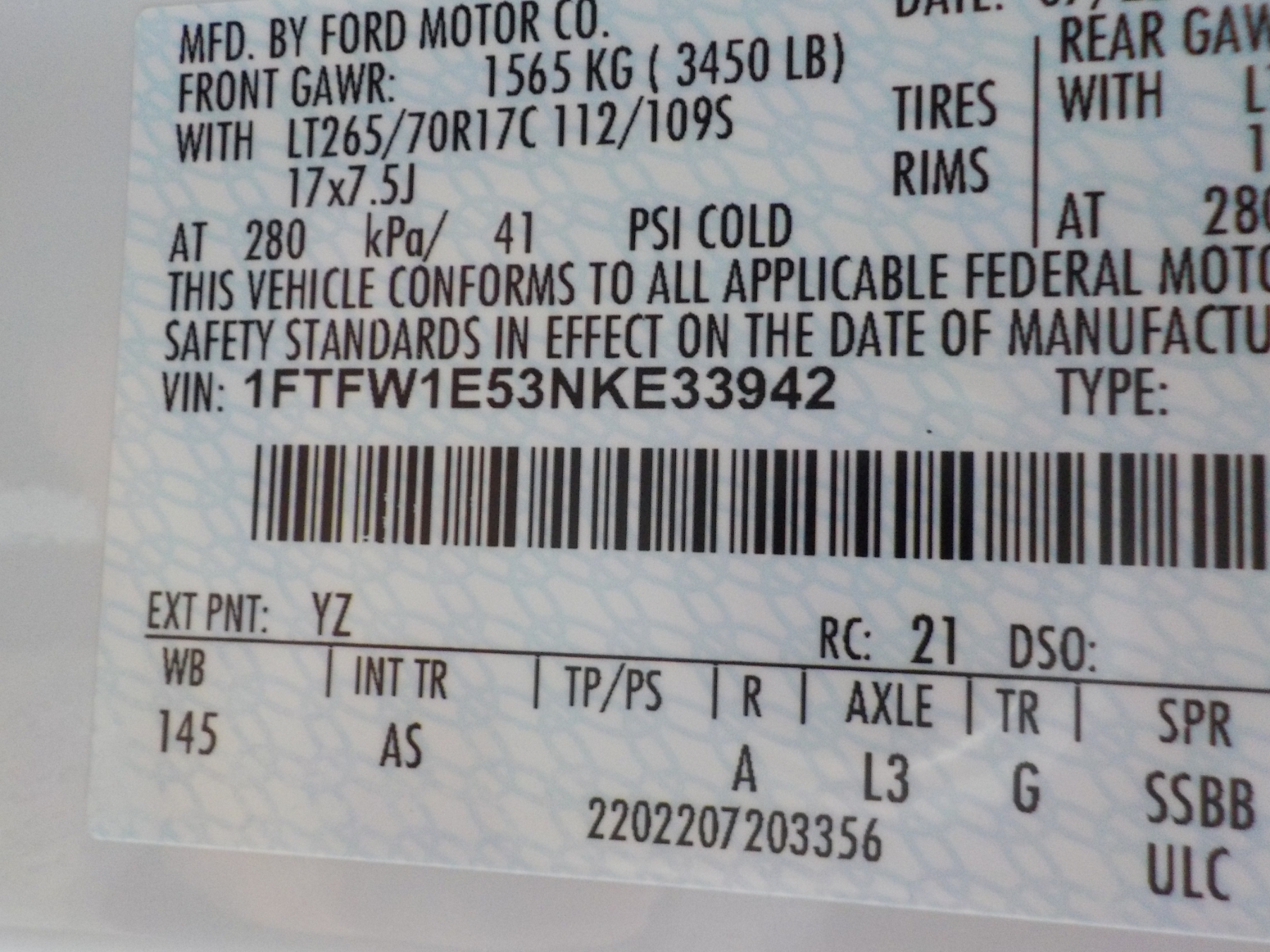 Vehicle ID Number: 1FTFW1E53NKE33942