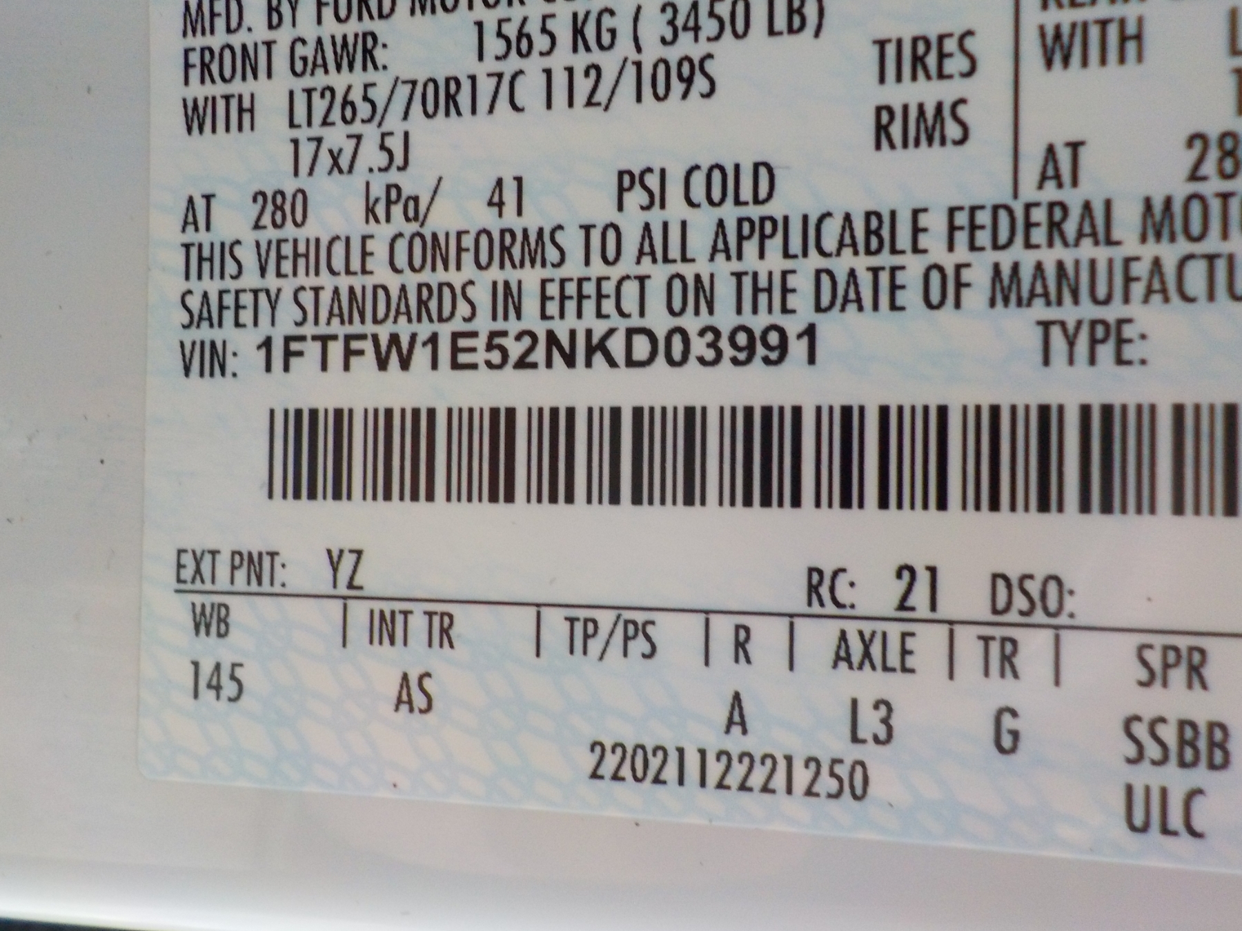 Vehicle ID Number: 1FTFW1E52NKD03991
