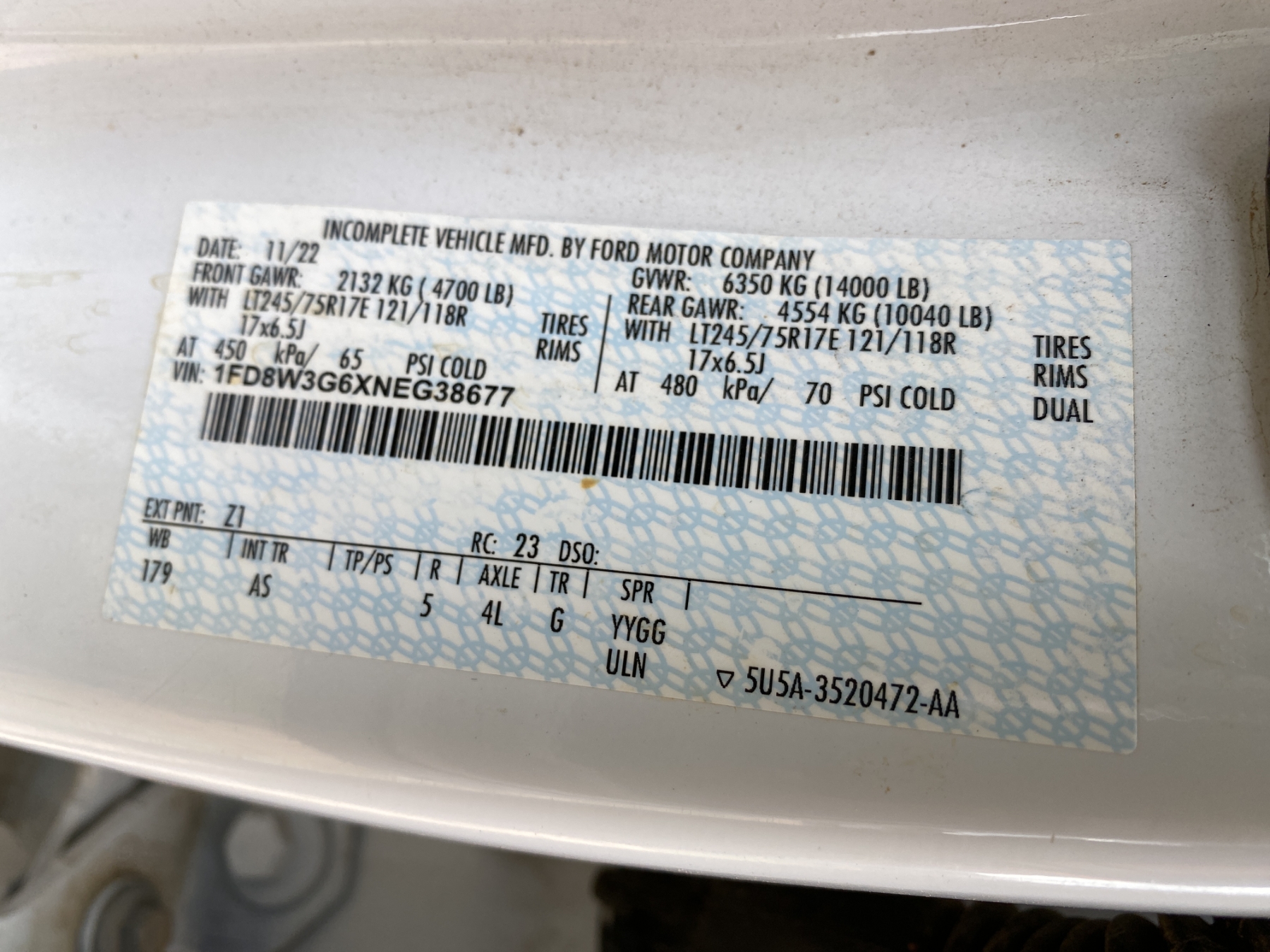 Vehicle ID Number: 1FD8W3G6XNEG38677