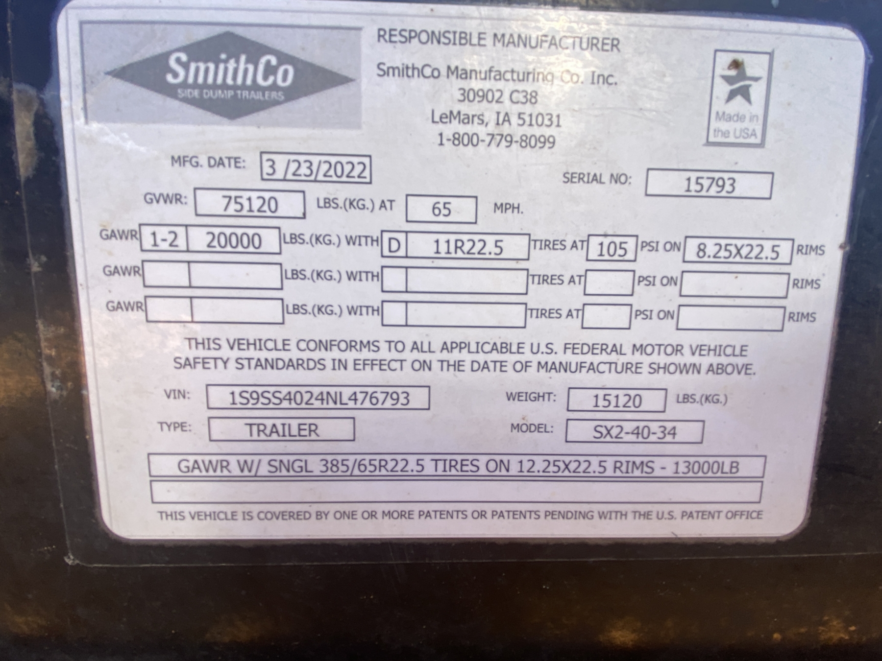 2022 SMITH CO SX2-40-34 Side Dump Trailer