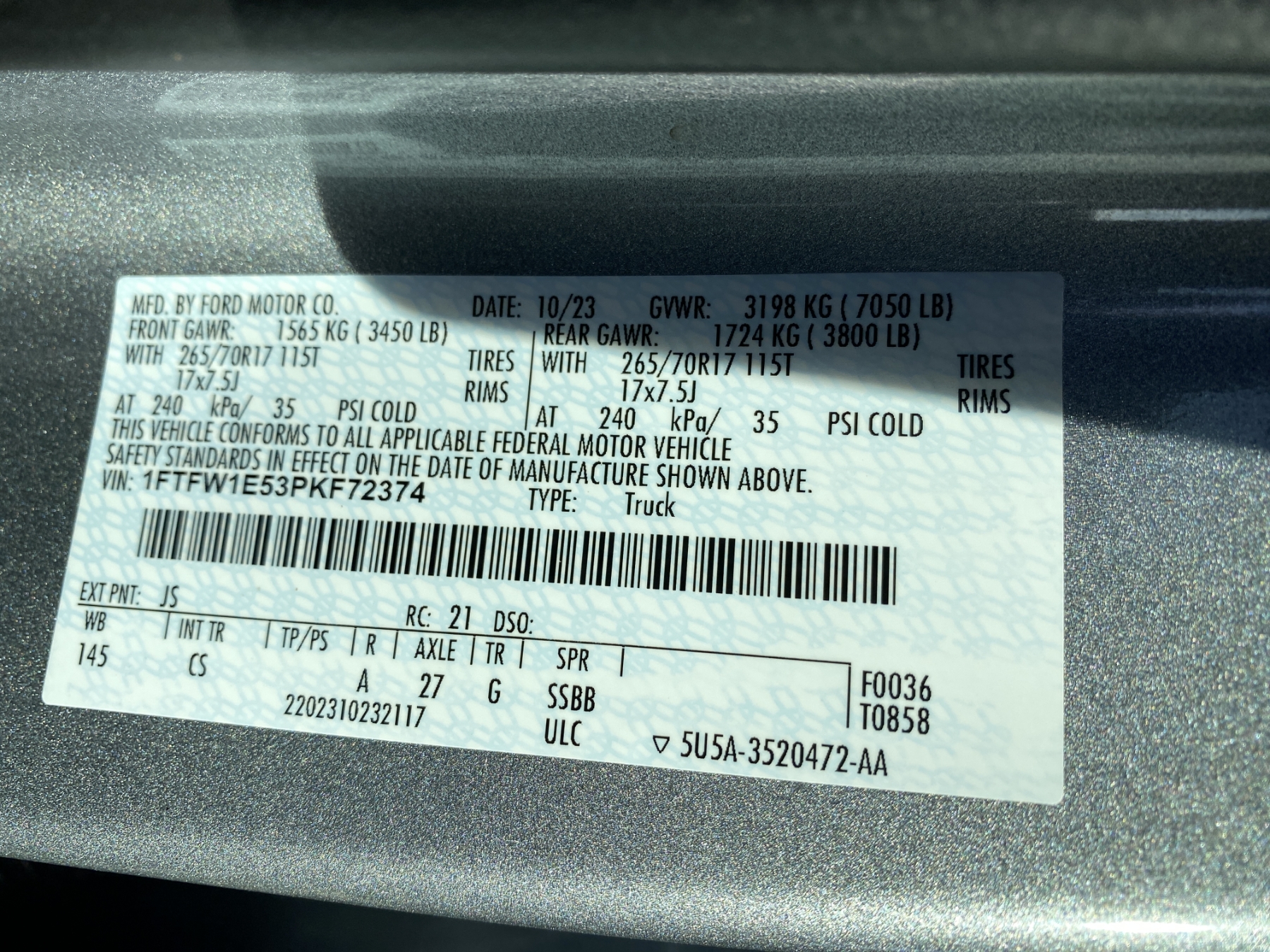 Vehicle ID Number: 1FTFW1E53PKF72374