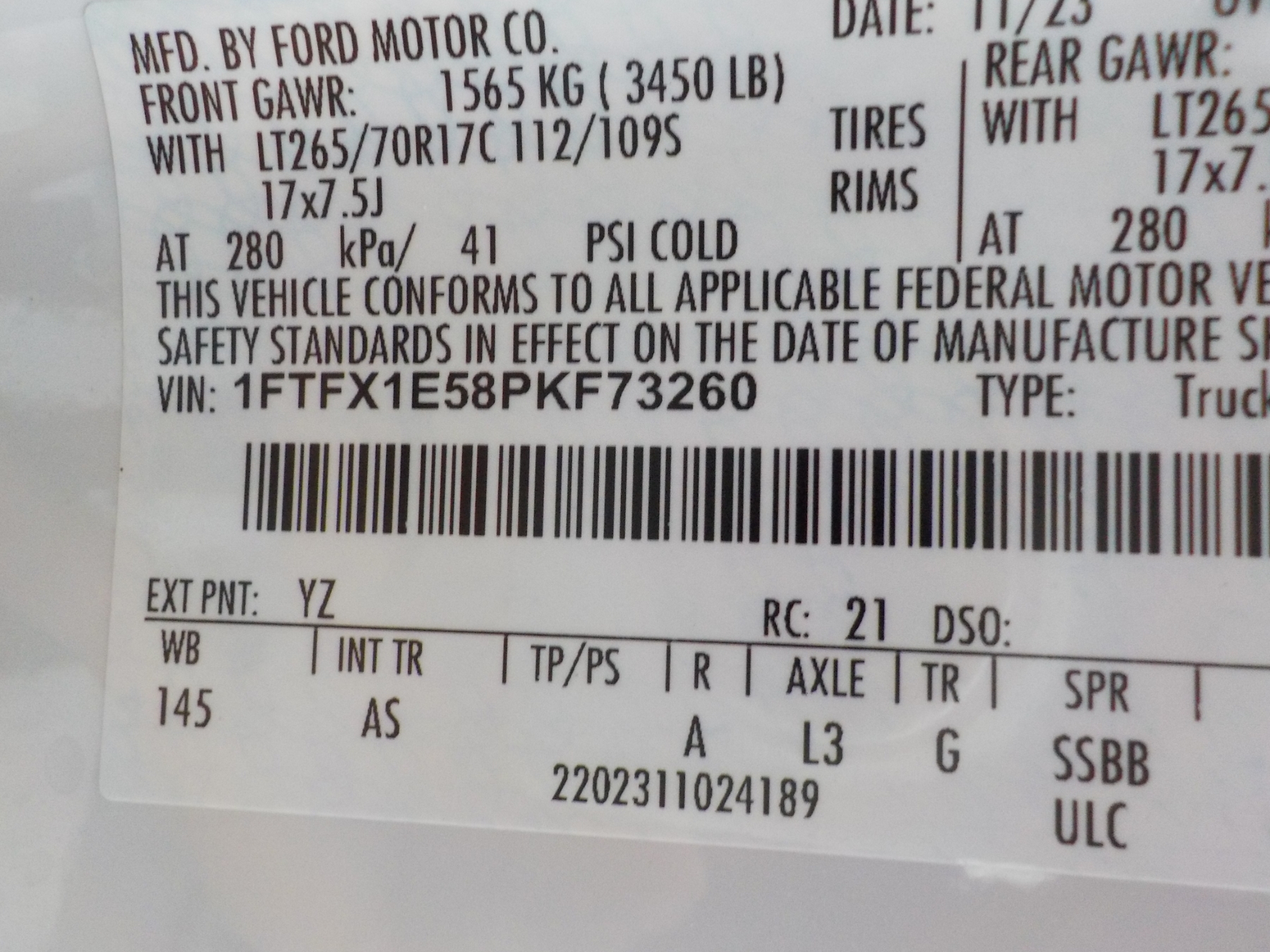 Vehicle ID Number: 1FTFX1E58PKF73260
