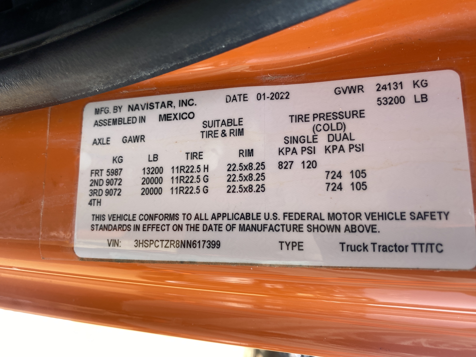 Vehicle ID Number: 3HSPCTZR8NN617399