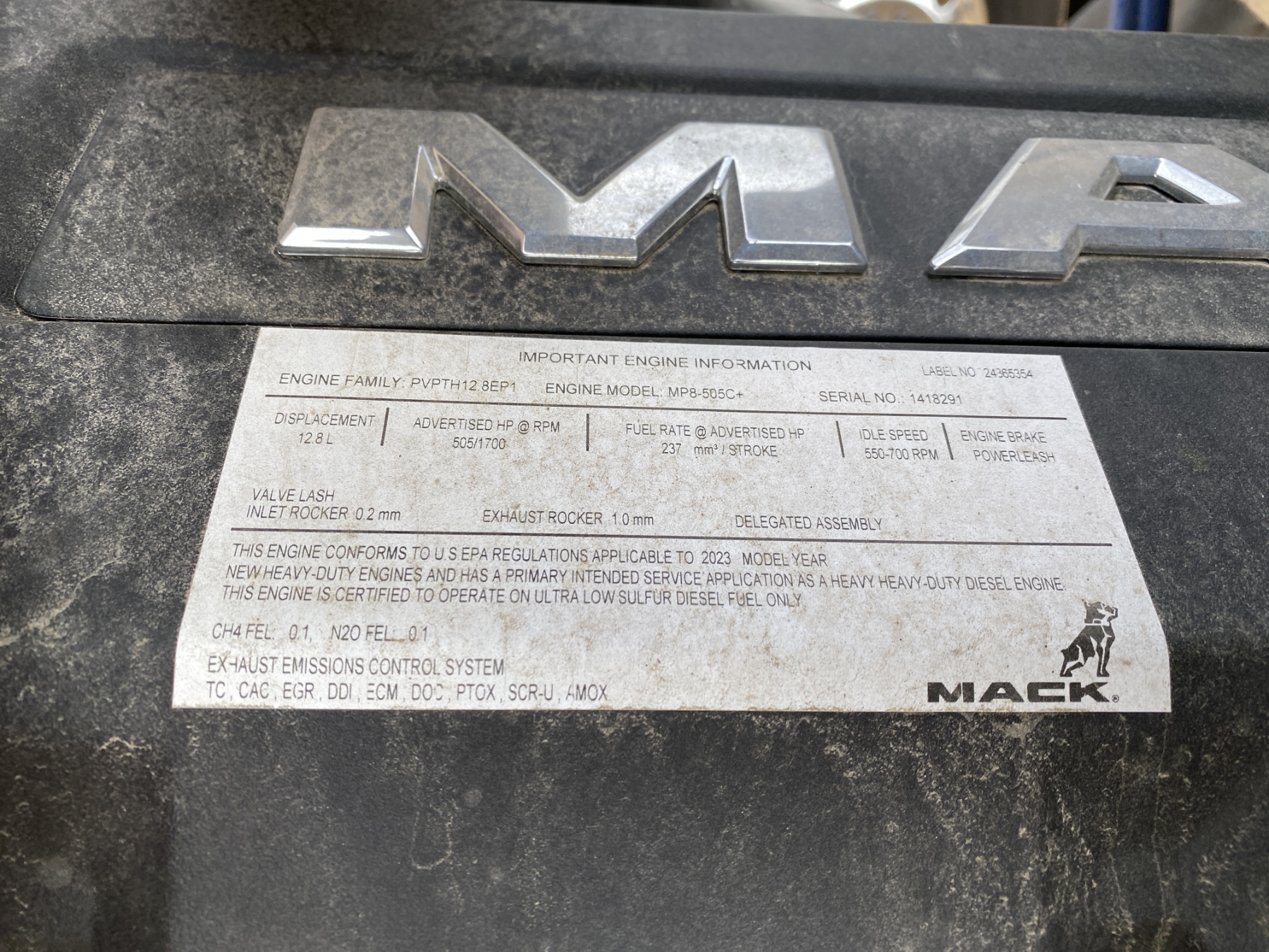 T/A, 505 HP Mack MP8 engine, Mack mDrive A/T, 46K rears, air ride, 14,320 lb. front, 236" W/B, wet kit, alum headache rack, 11R24.5 tires, all alum
