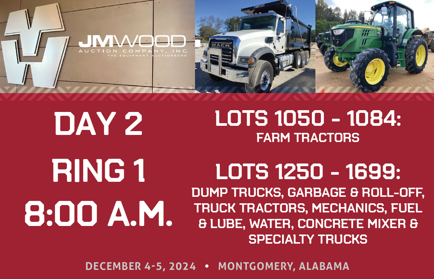 1) JM Wood Auction Co., Inc. ("The Auctioneer") will offer for sale by auction ("The Auction") items of equipment ("Equipment) either singularly or in groups ("Lot")