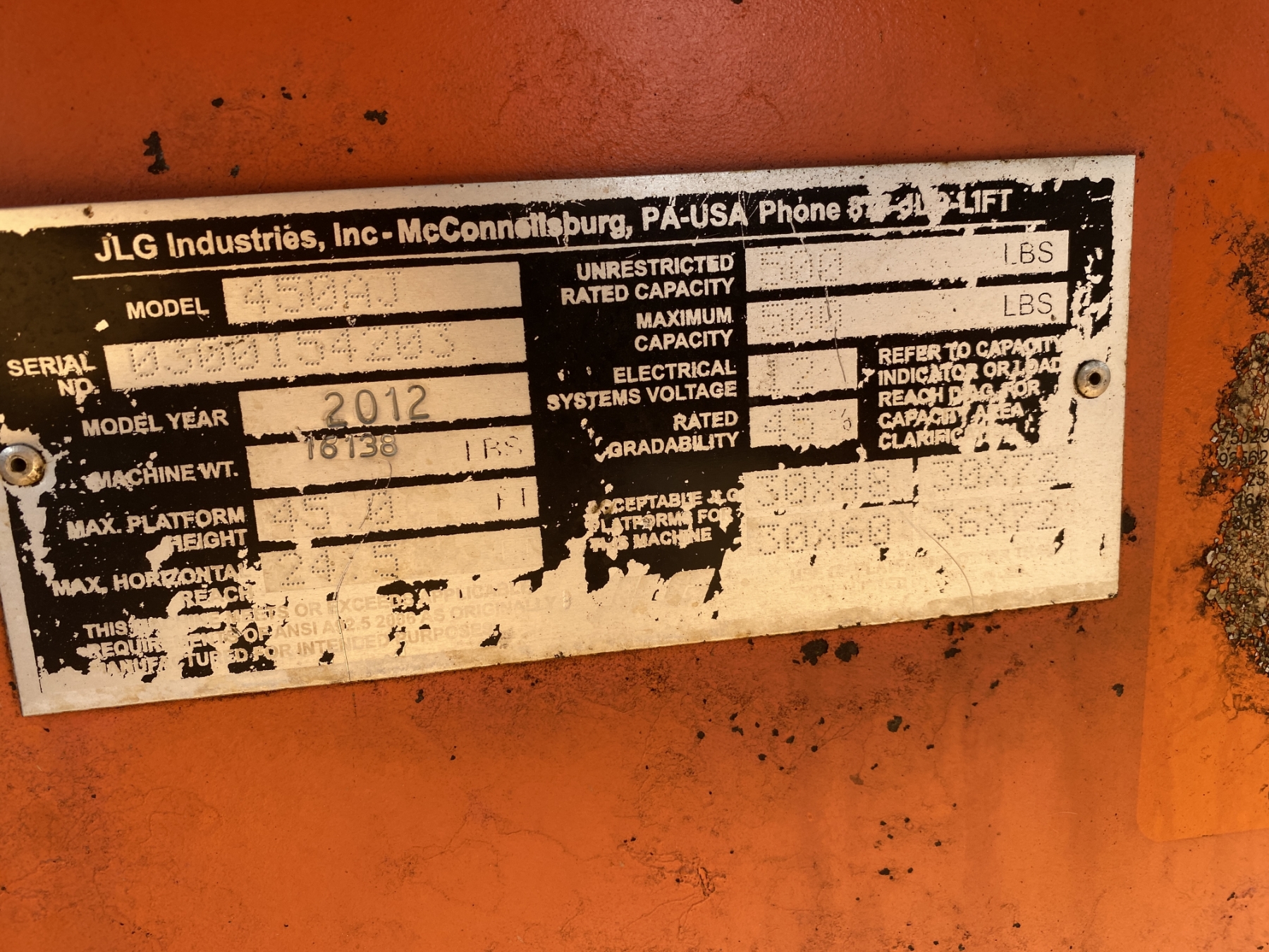 45' platform height, 500 lb. capacity