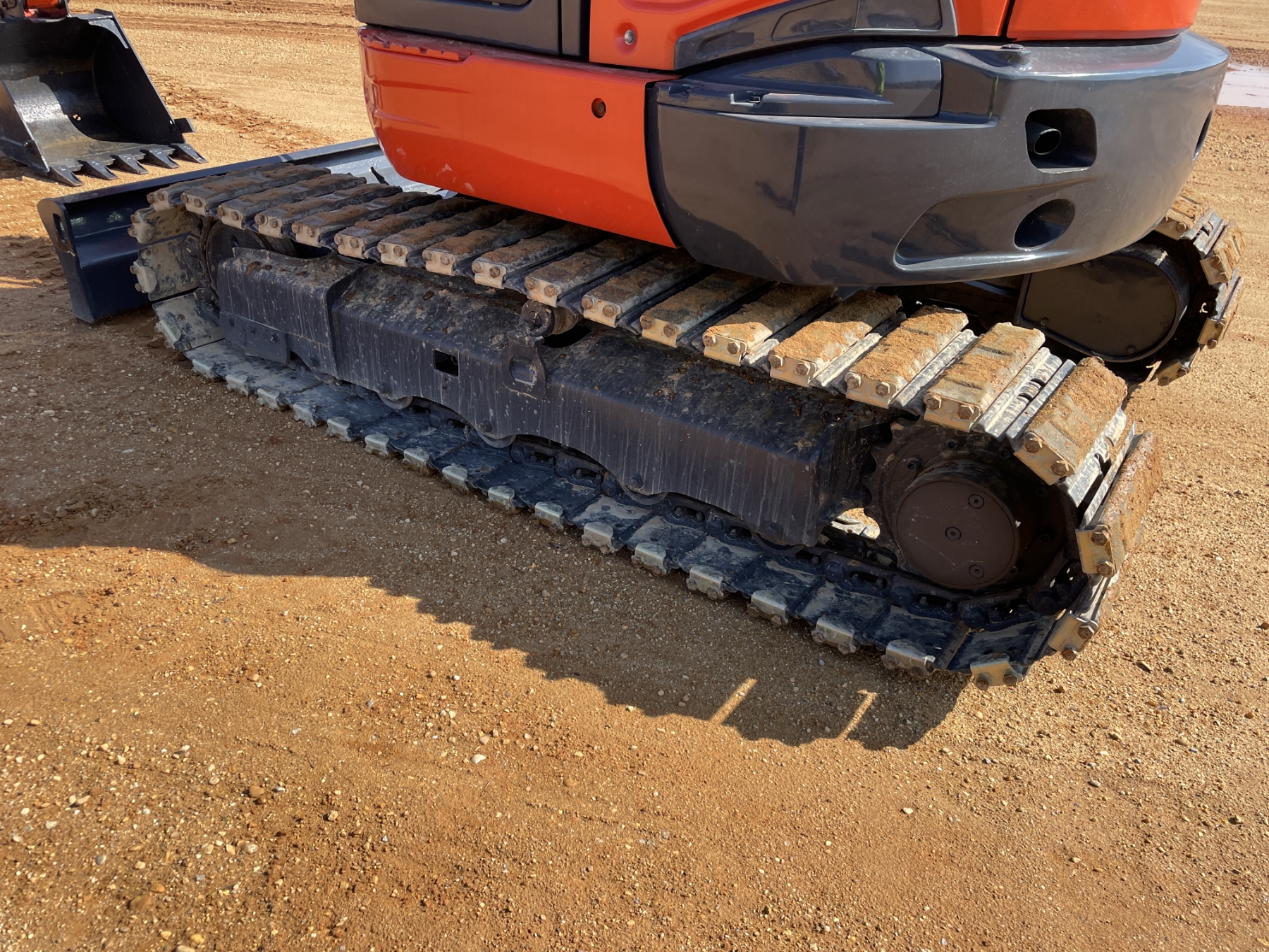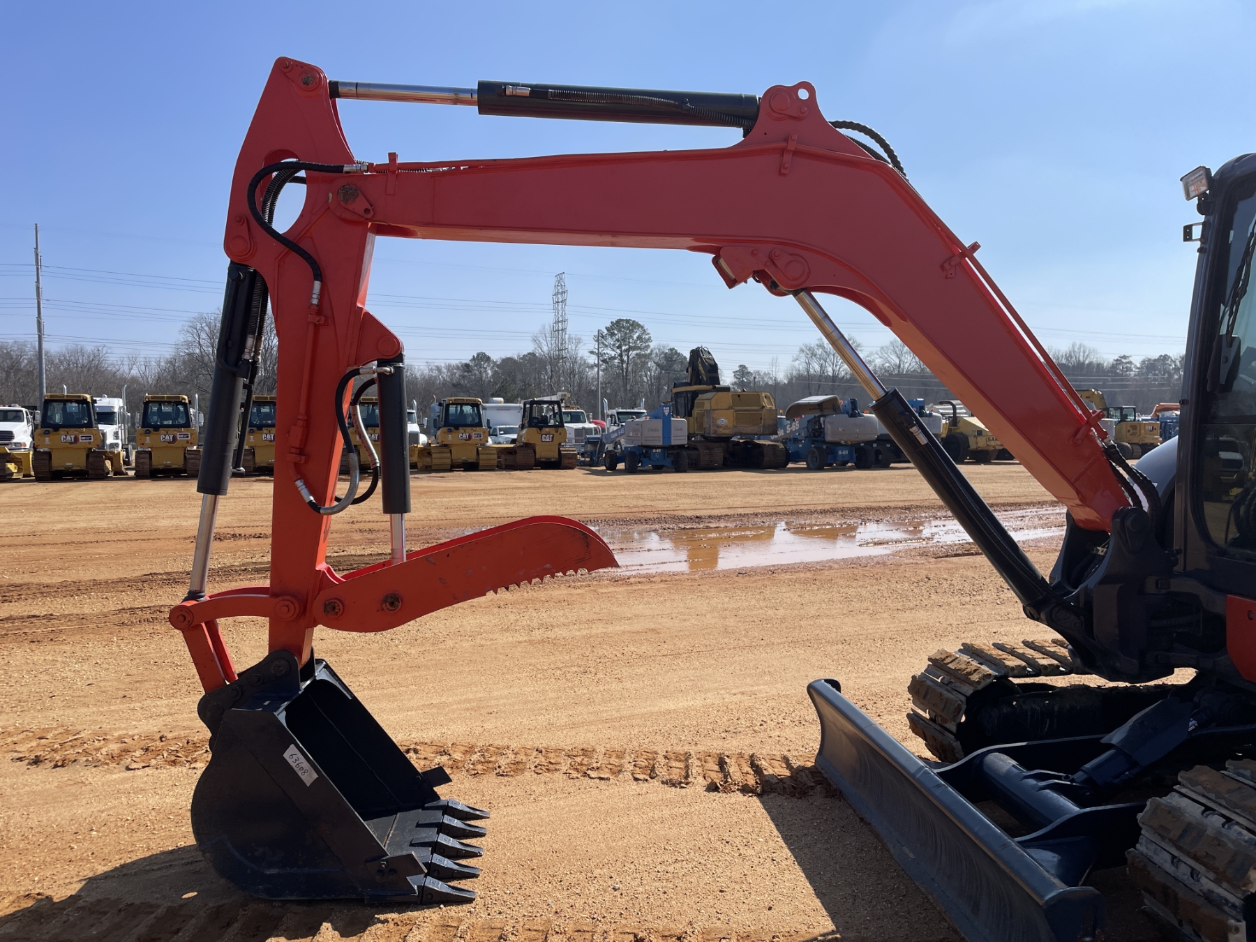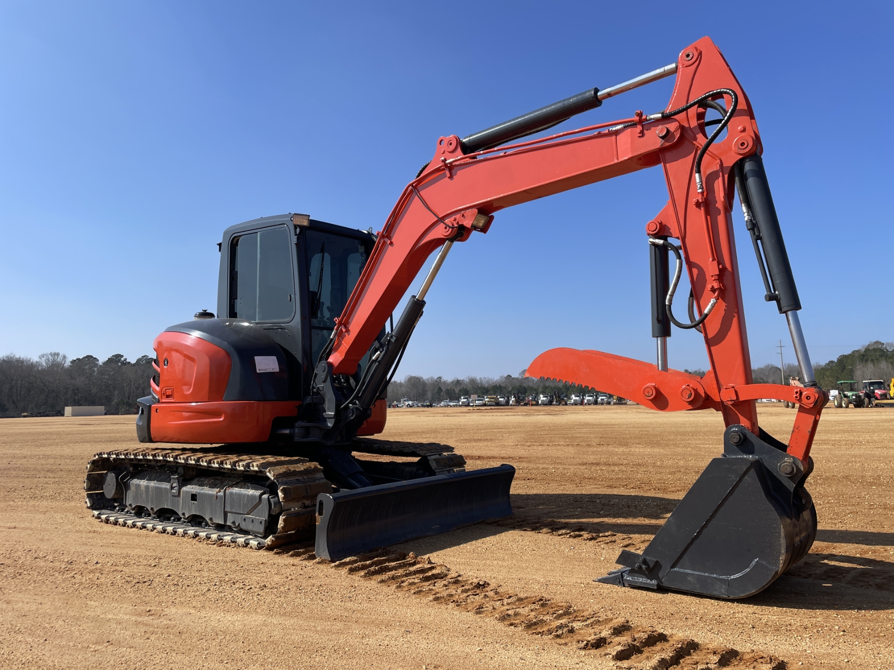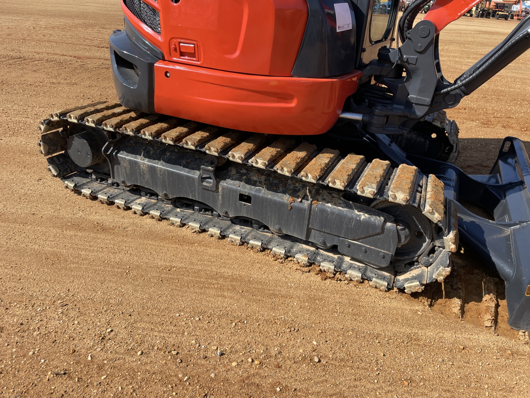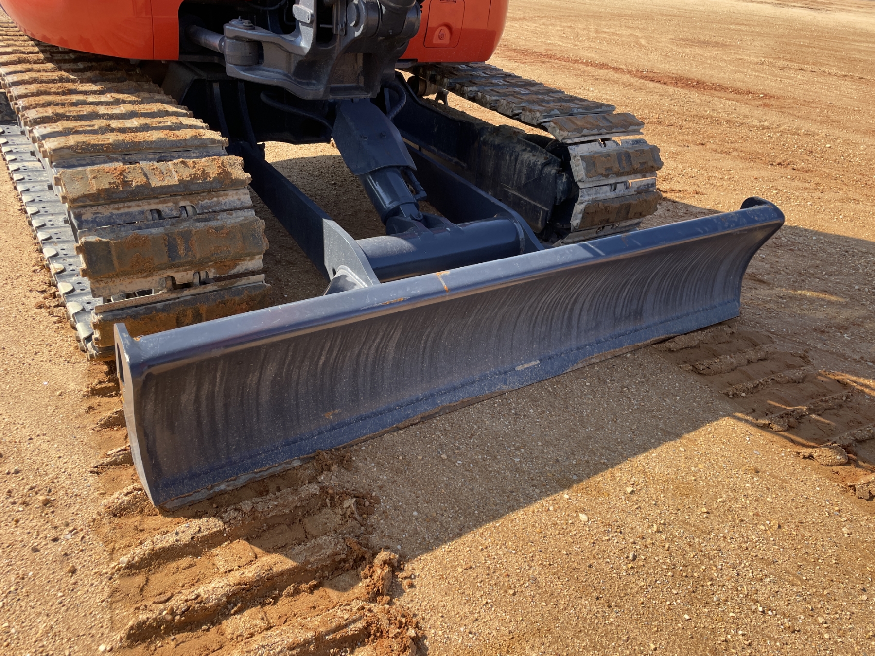 5' 3" stick, 30" bucket, hyd thumb, aux hyd, blade, rubber pad inserts, cab, A/C