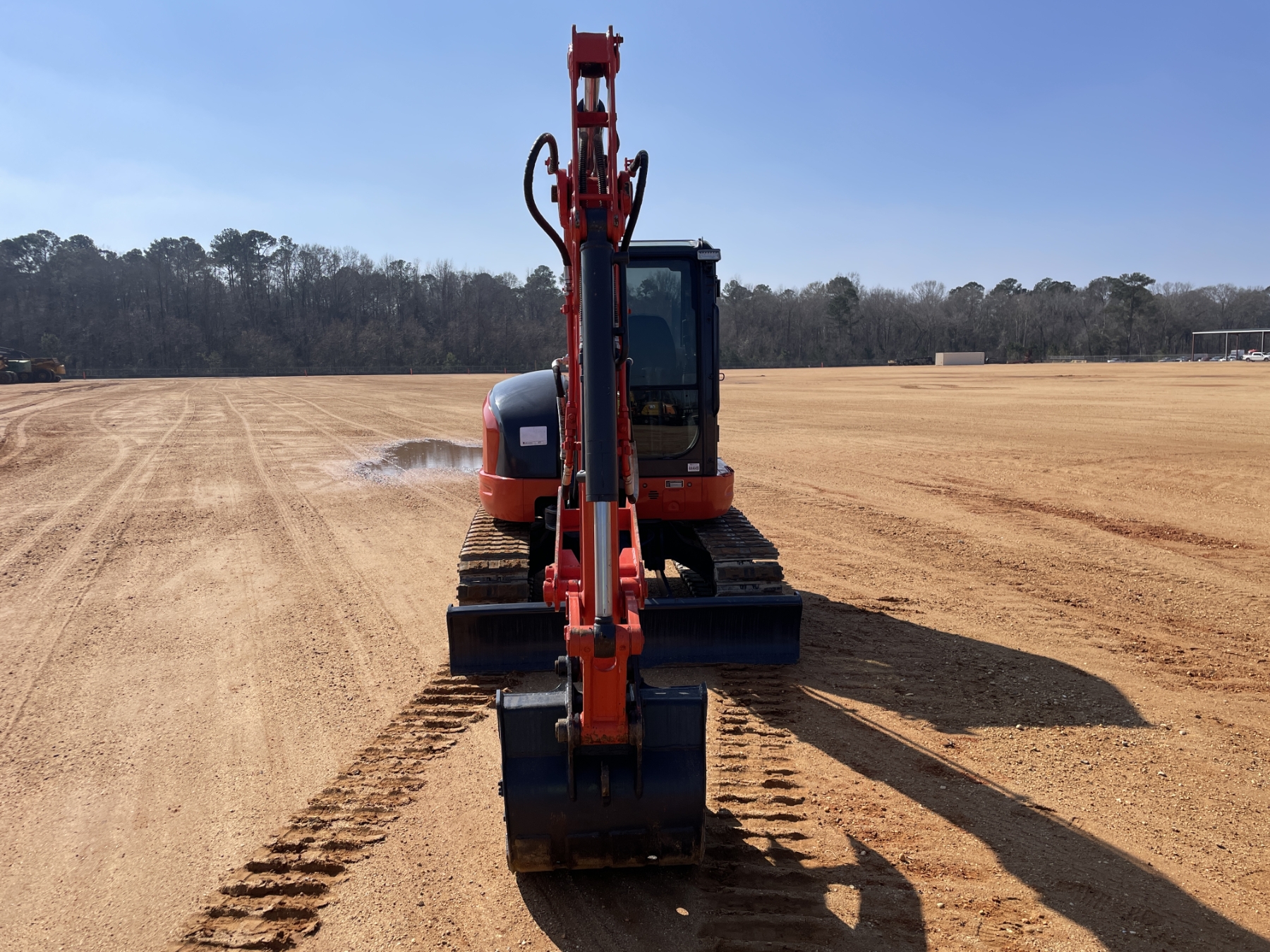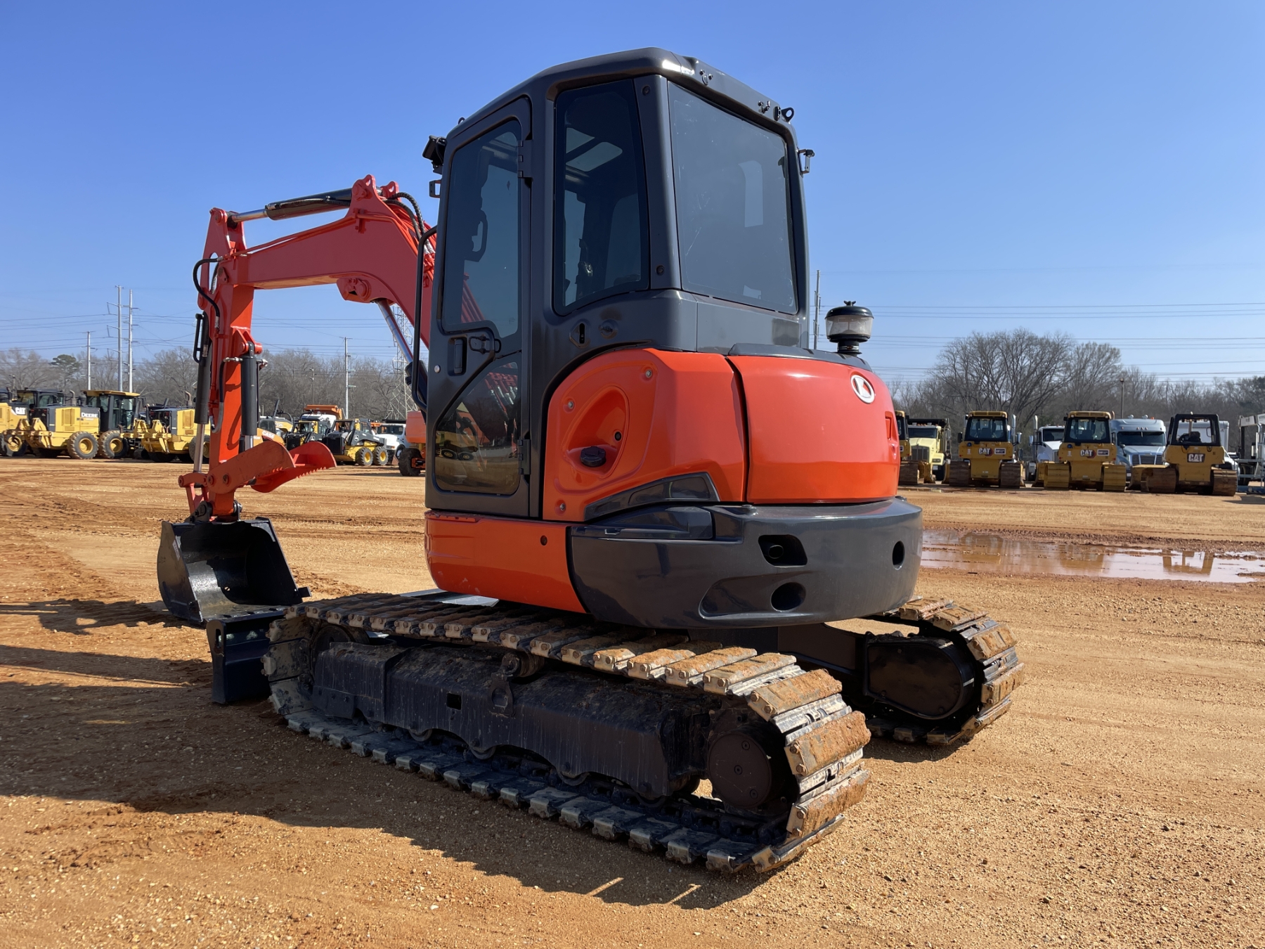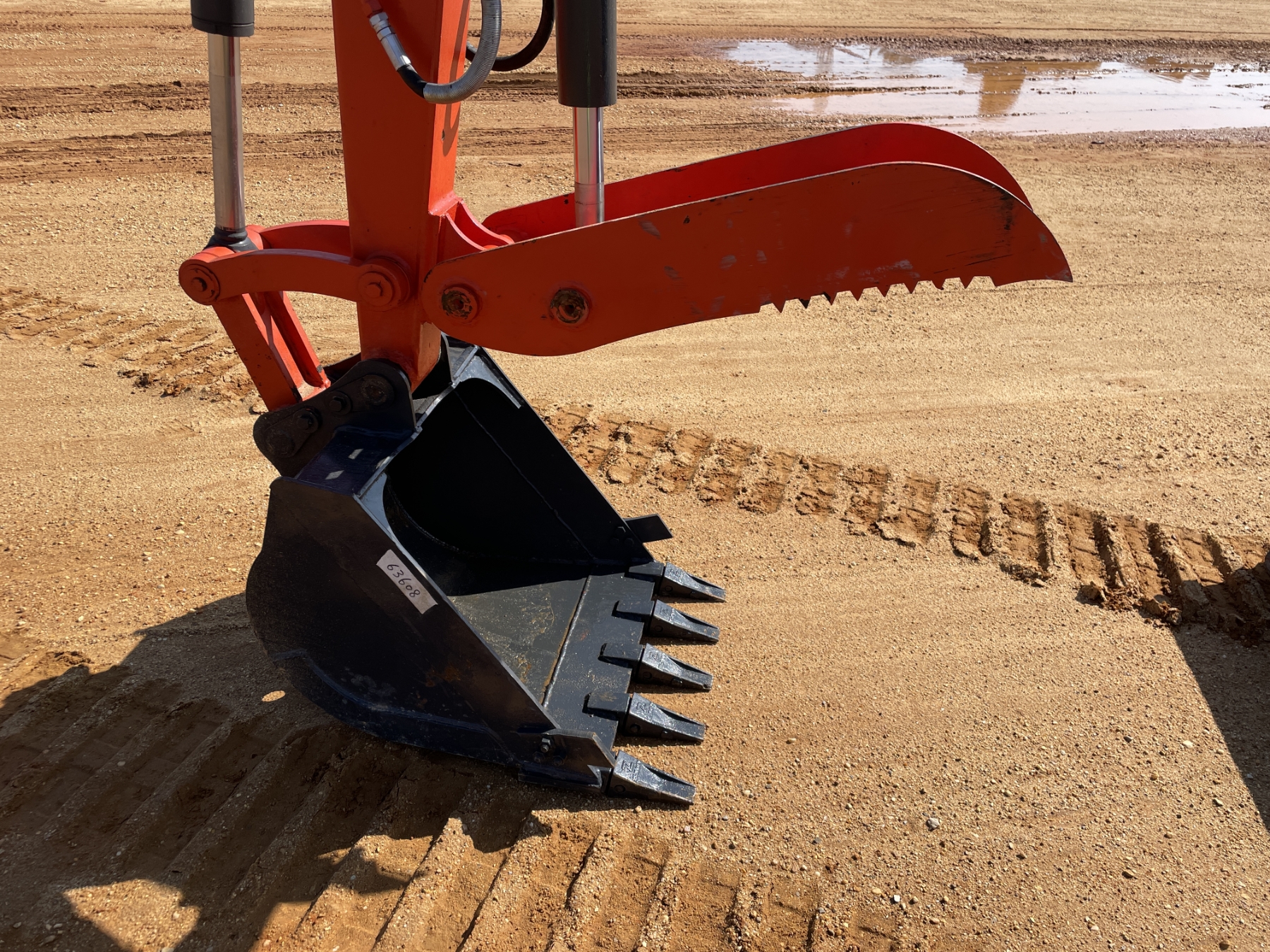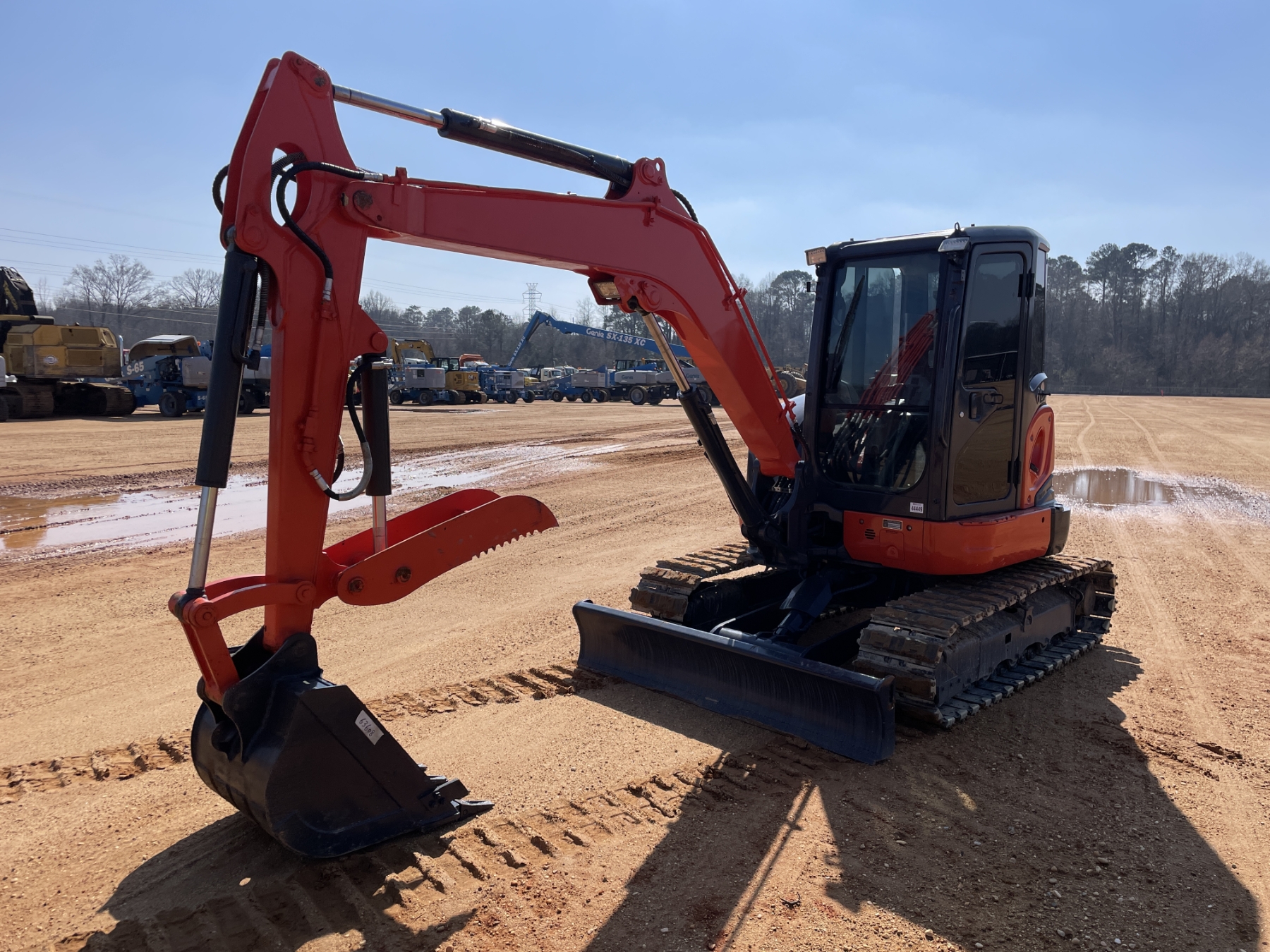 5' 3" stick, 30" bucket, hyd thumb, aux hyd, blade, rubber pad inserts, cab, A/C
