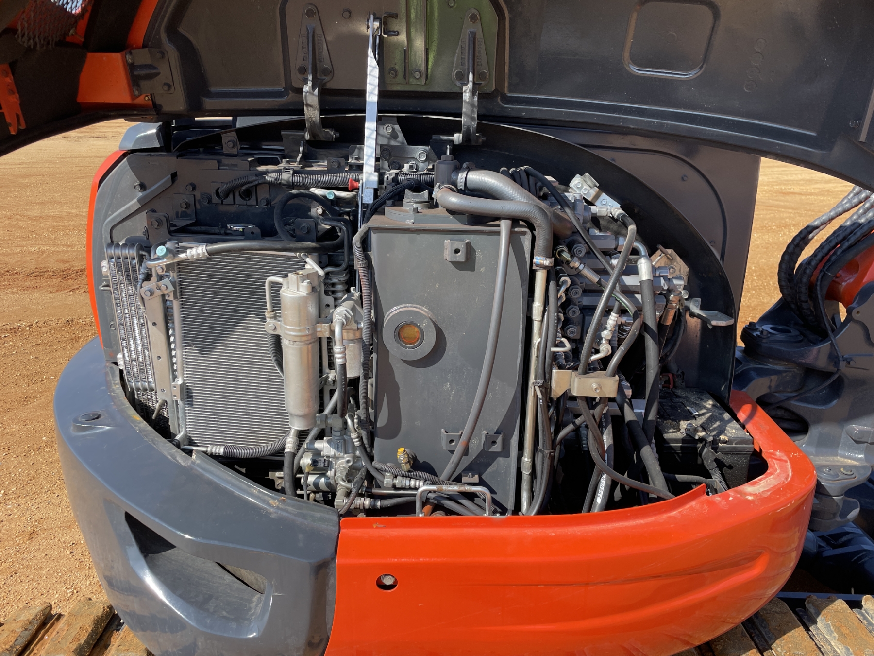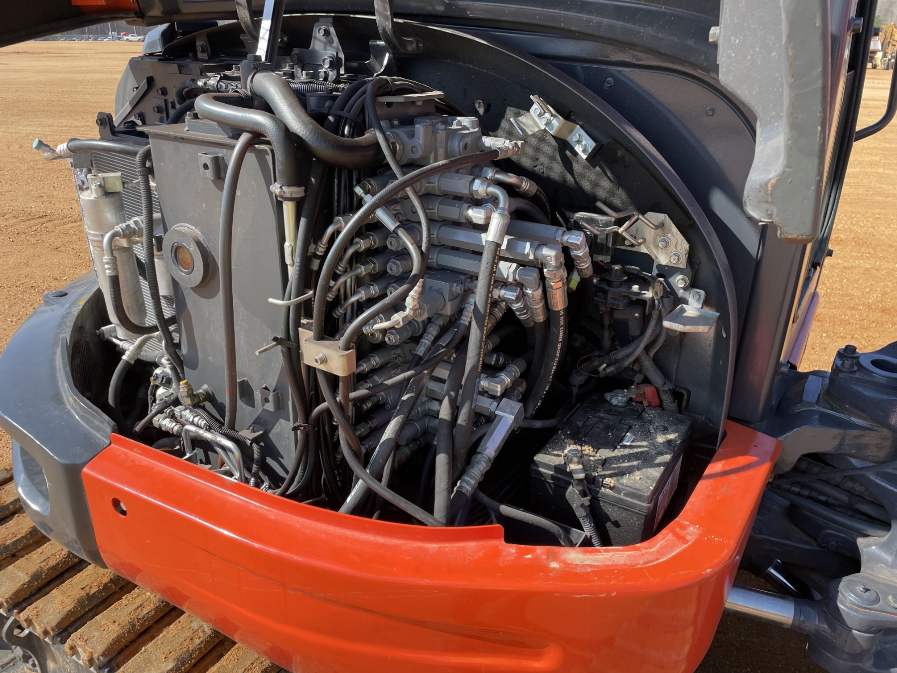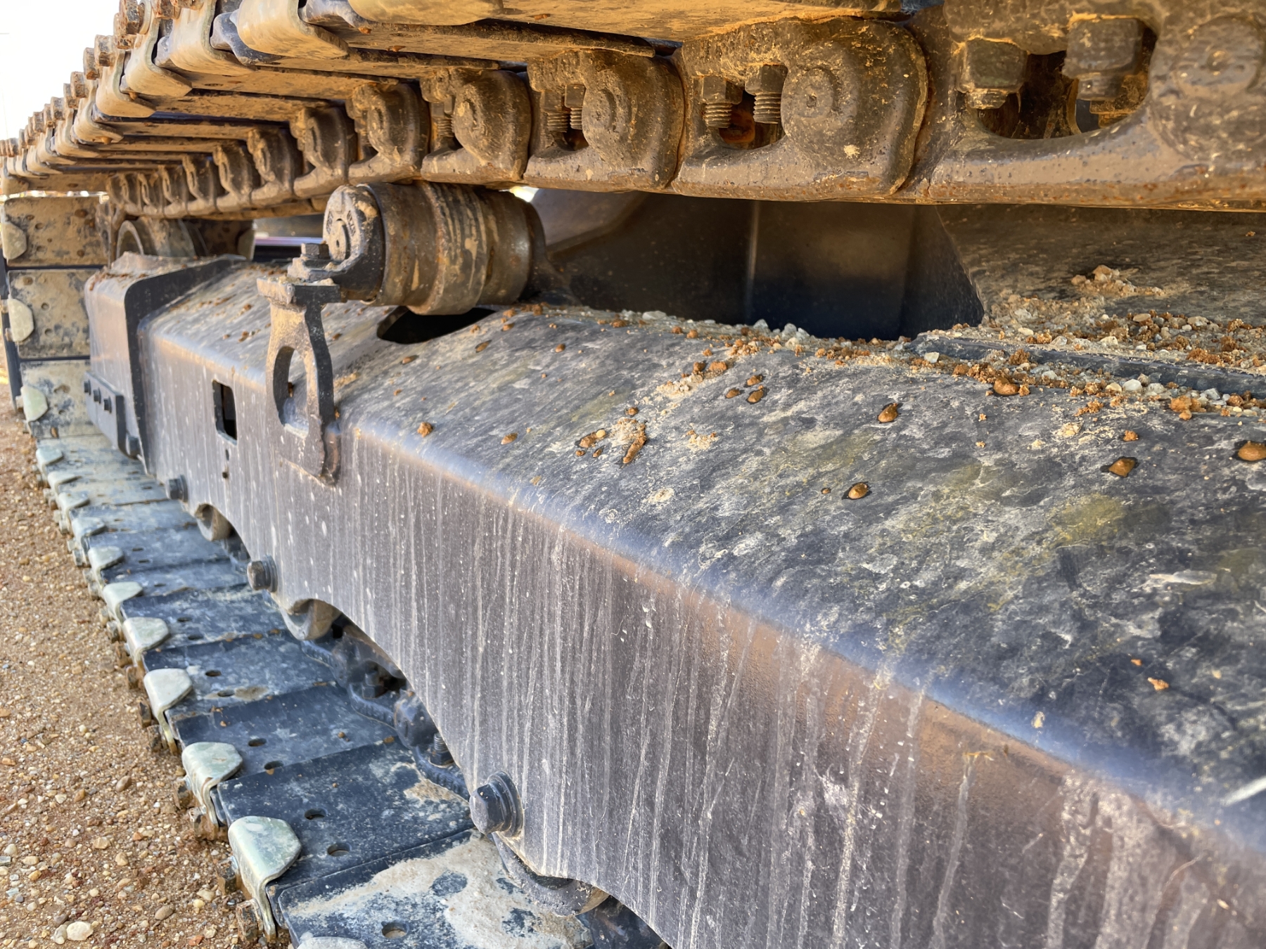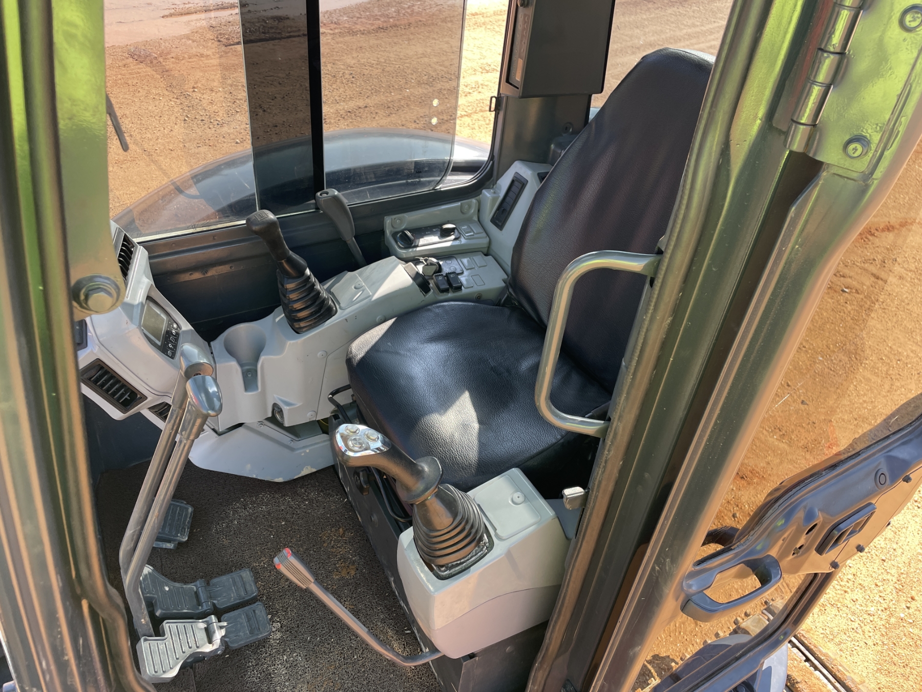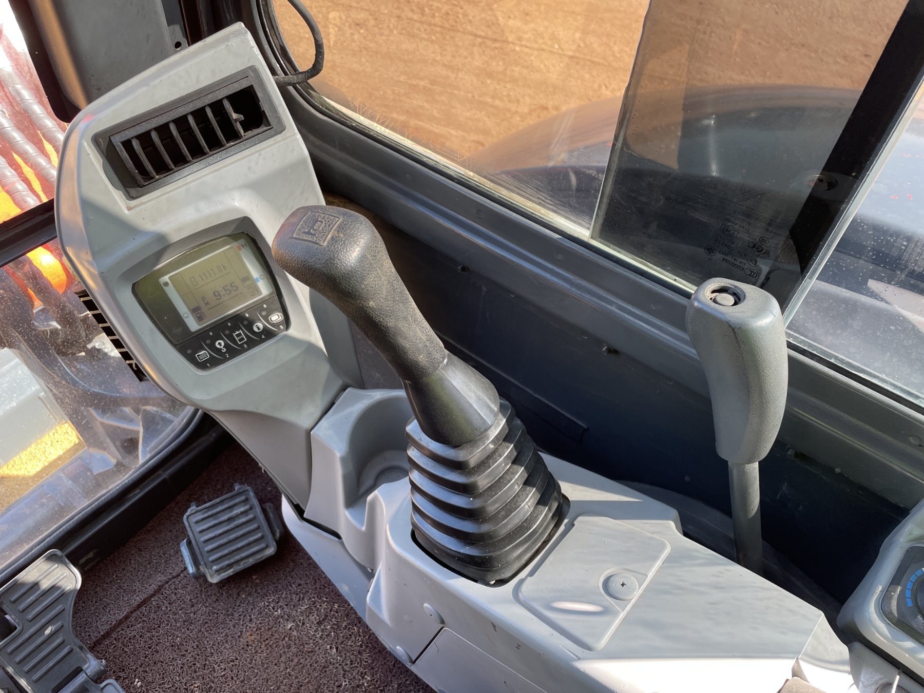 5' 3" stick, 30" bucket, hyd thumb, aux hyd, blade, rubber pad inserts, cab, A/C