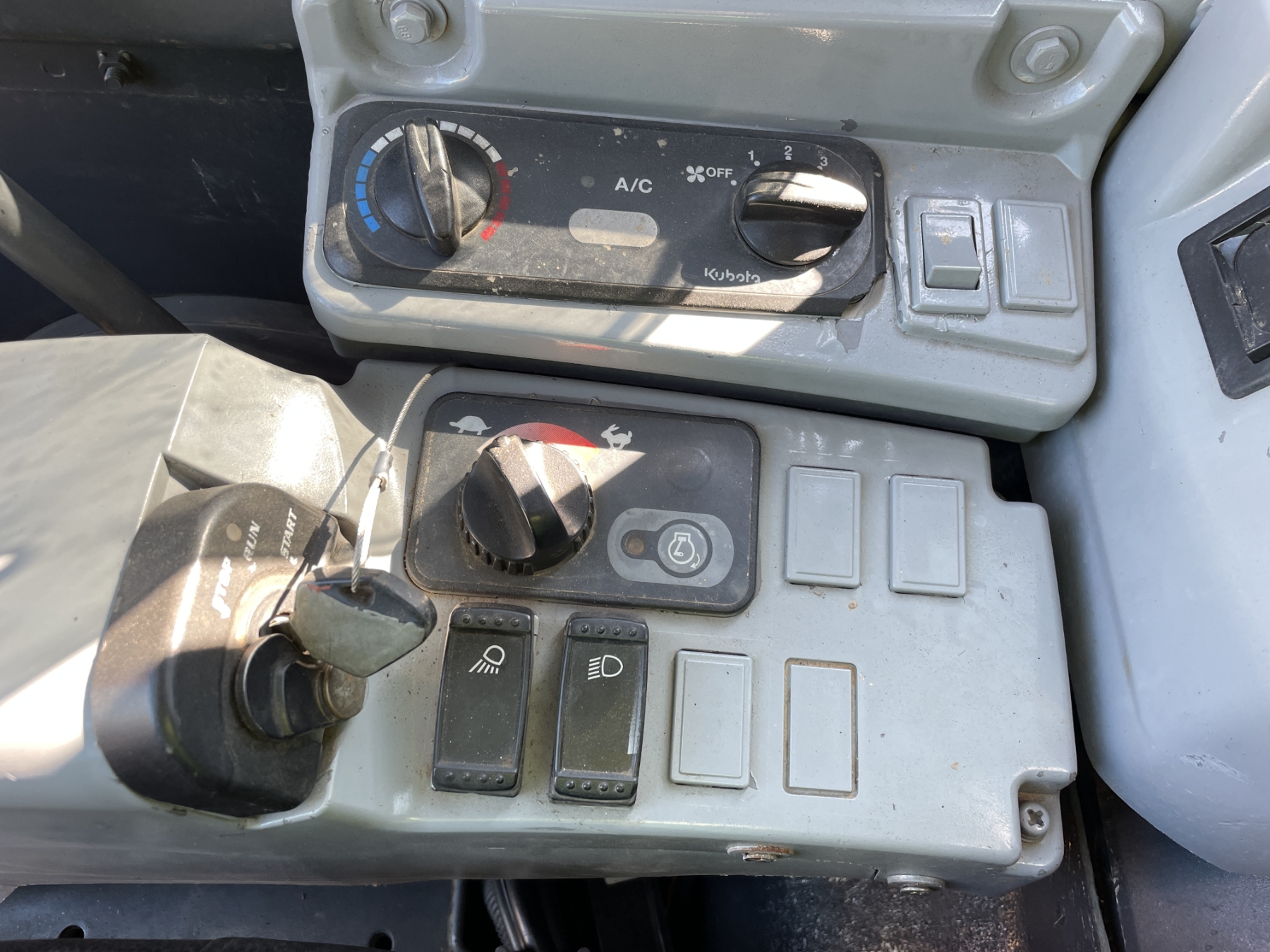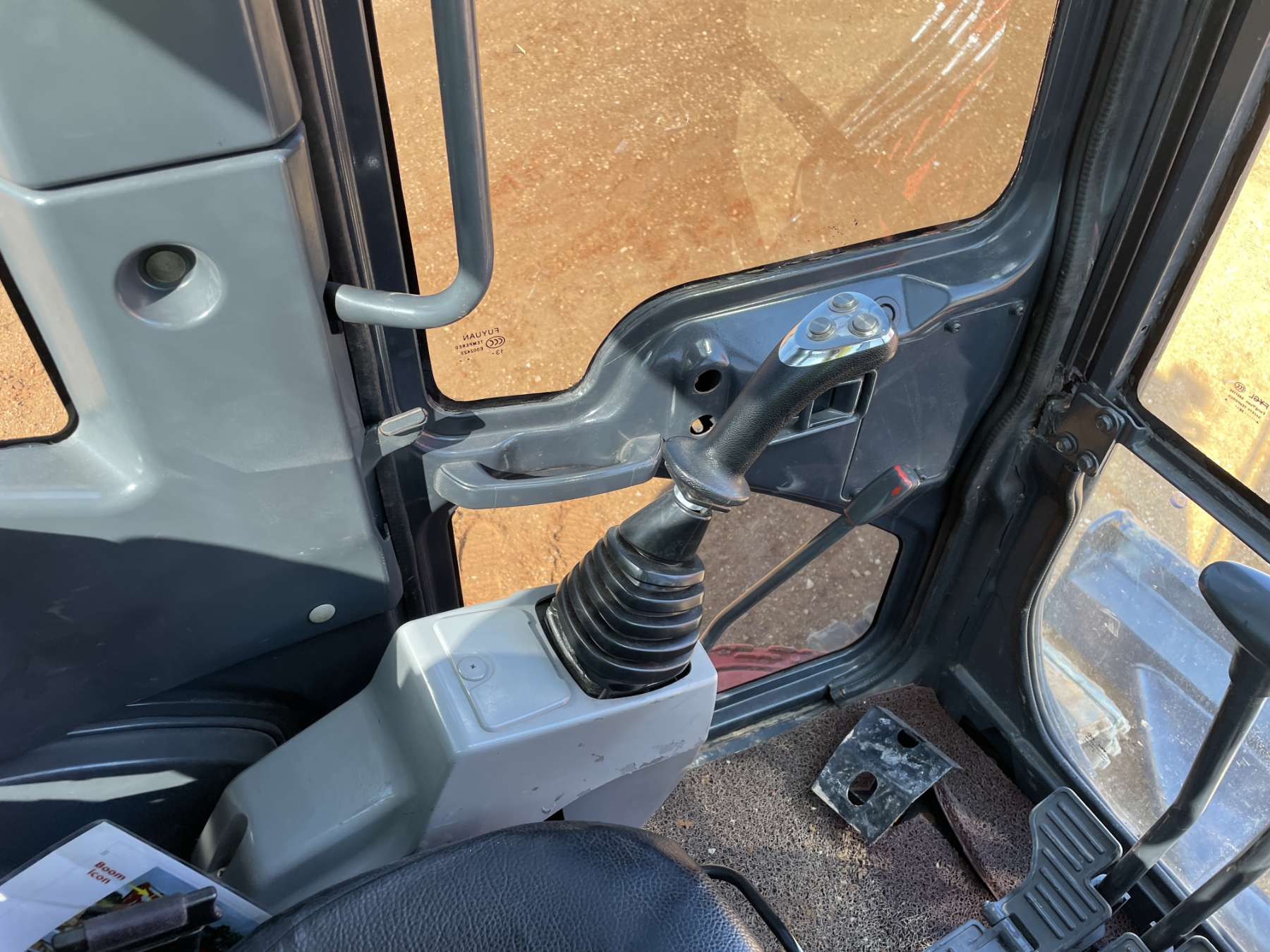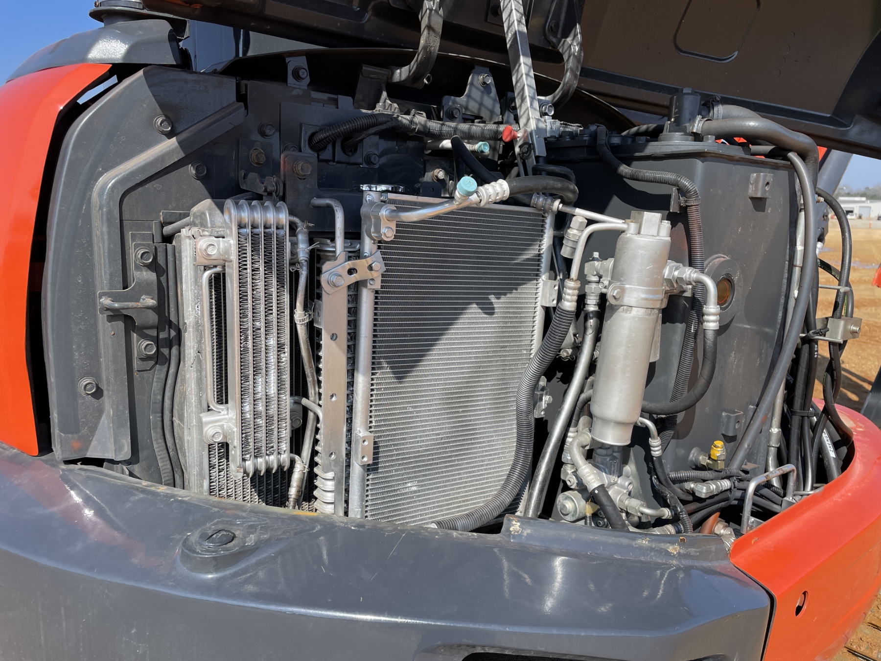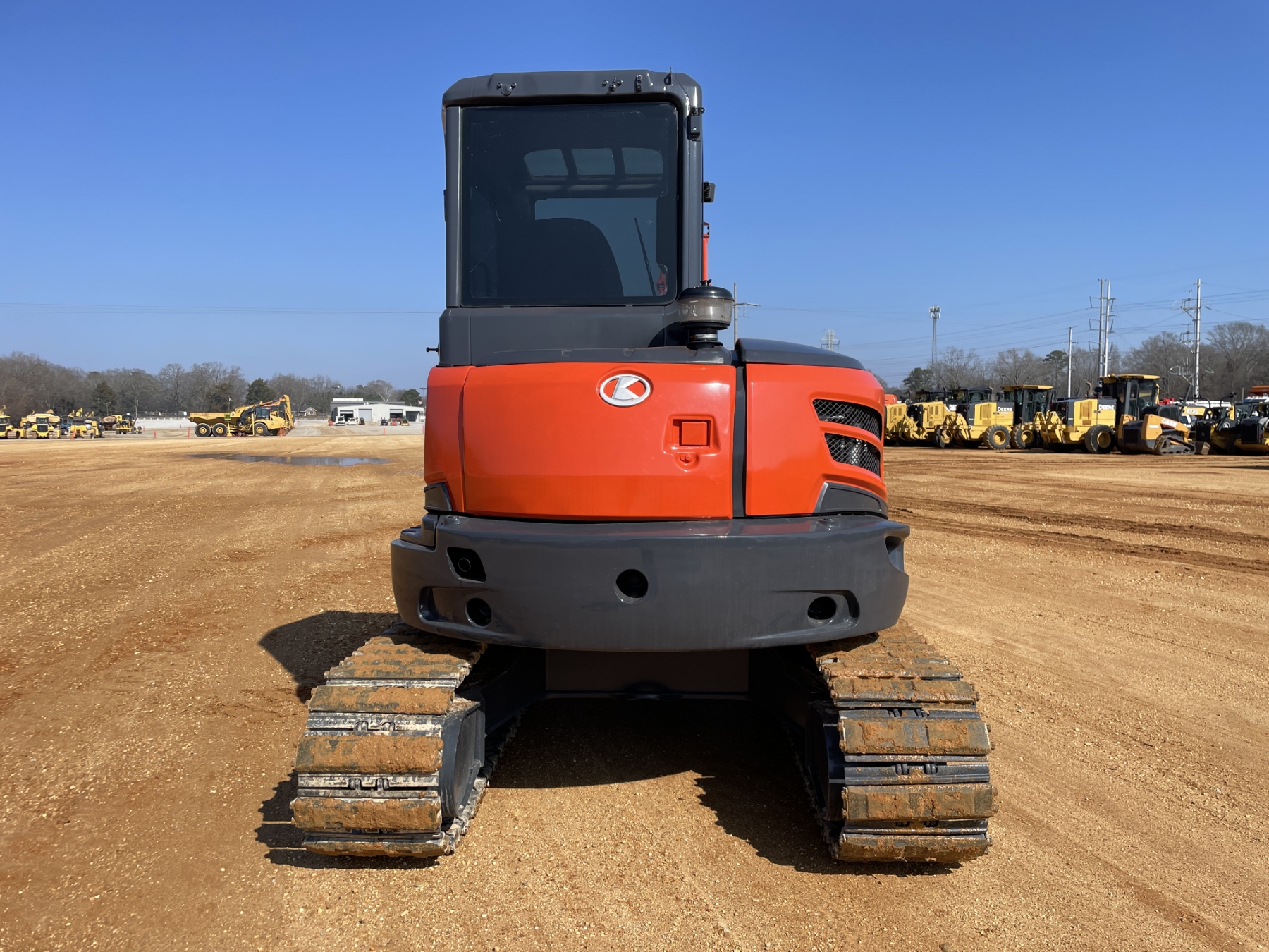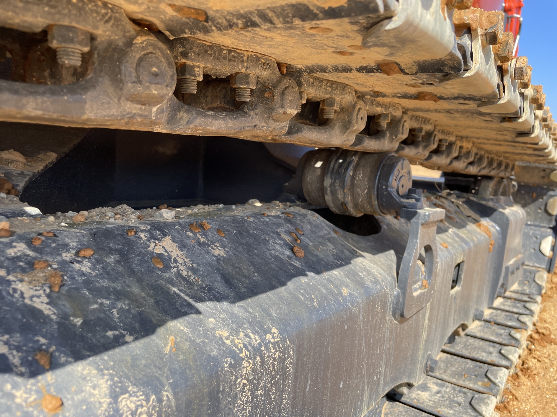 5' 3" stick, 30" bucket, hyd thumb, aux hyd, blade, rubber pad inserts, cab, A/C