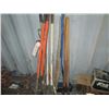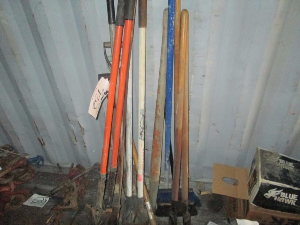 LOT OF MISC POST HOLE DIGGER, SHOVEL, BROOMS