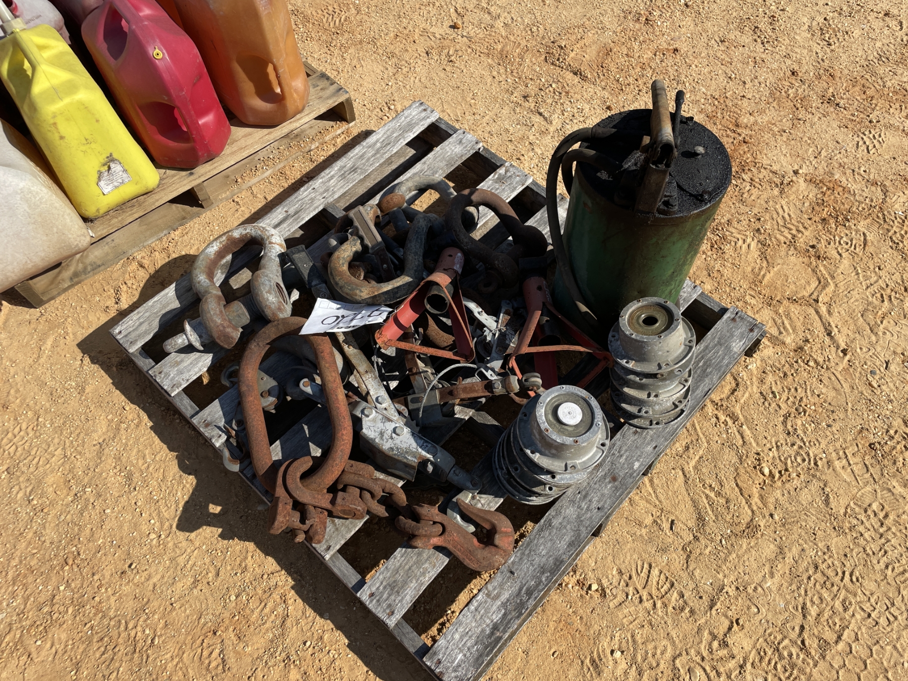 MISC CLEVISES, COME ALONGS, JACKSTANDS, HUBCAPS, PUMP