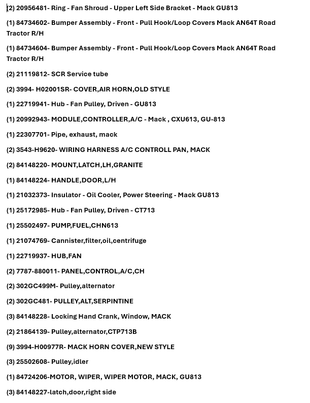 NEW/UNUSED MACK TRUCK PARTS
